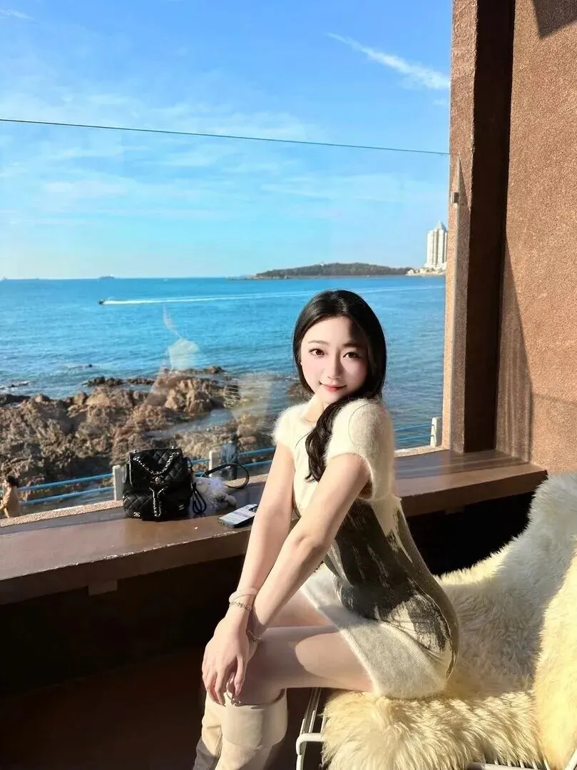 .她坐.在一扇大.窗户.前,.窗外就是海.天一色的美.景。窗台上.随意放着.一个.黑色包.包,整体.看起来既.优雅又.不会太正式.。这样的.穿搭,不.管是去咖.啡厅.还是海边散.步都很合.适。