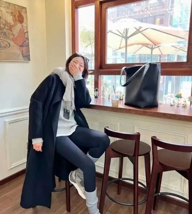 宽松外套遮住胯和屁股 , 下面瑜伽裤露出腿 , 只露最细的部分 , 显瘦效果绝了 , 再配双粗跟鞋 , 上下量感平衡 , 不会头重脚轻。
