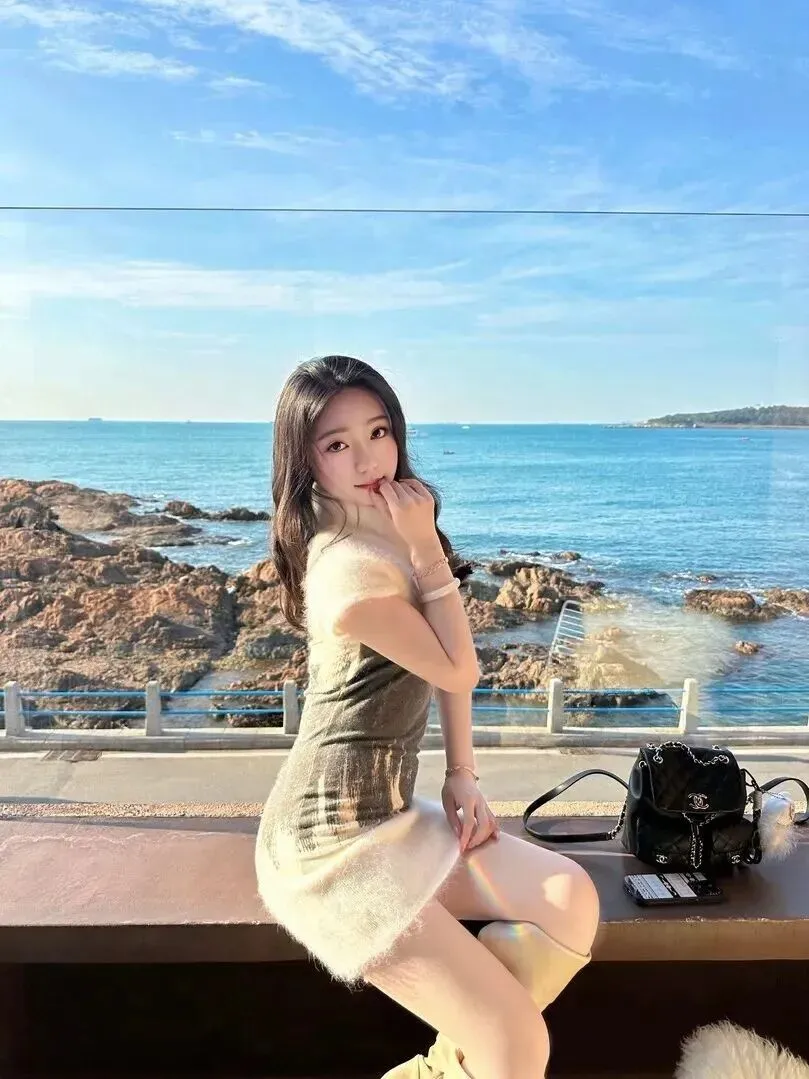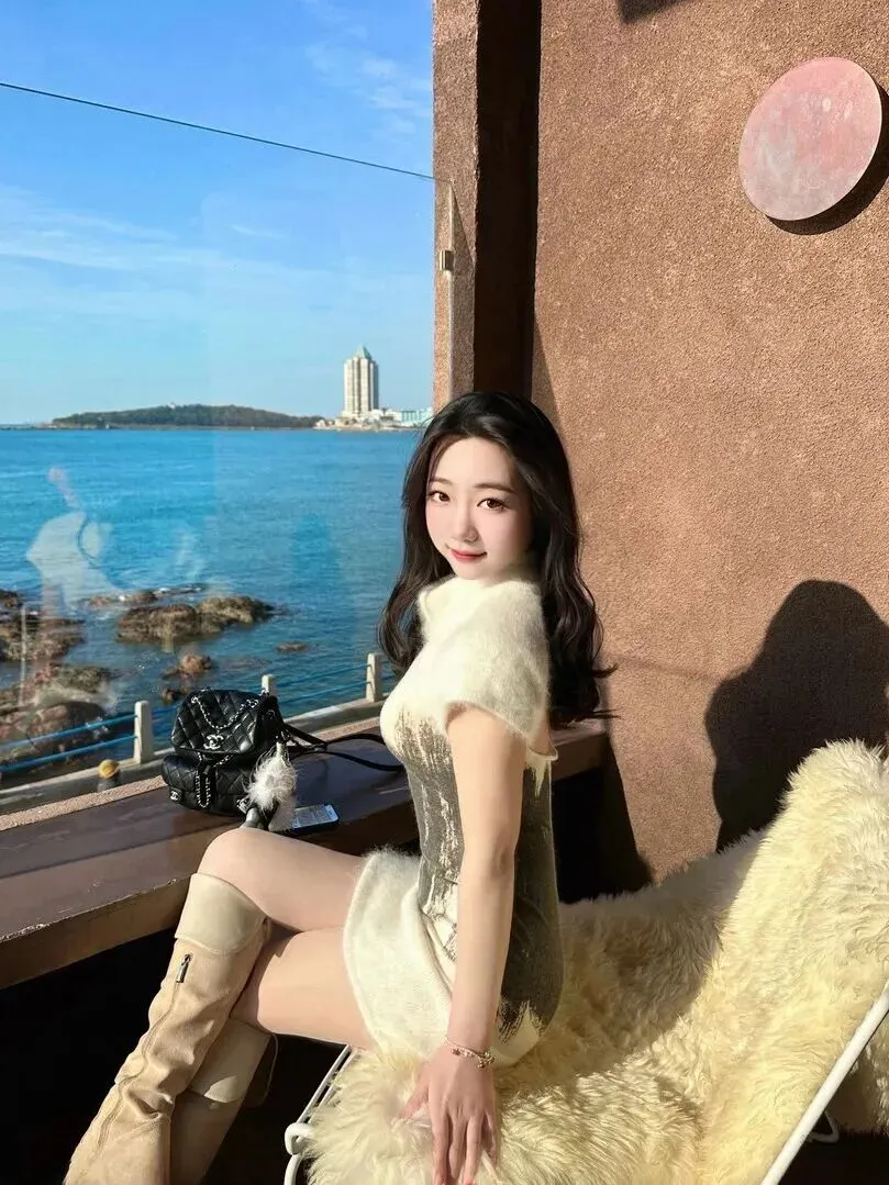 .白色的毛.绒连.衣裙,.配上.灰调的纹.理,.看起来就.软乎.乎的。修.身的剪裁.特别显身.材,.再搭一.双米白.色的长靴,.整个人都显.得温柔.起来.。她坐在.海边的.平台上,.闭着眼睛吹.风,背.后的.海和船成.了最.美的.背景。.这一身把冬.天的暖和海.边的浪漫.都穿在了身.上。