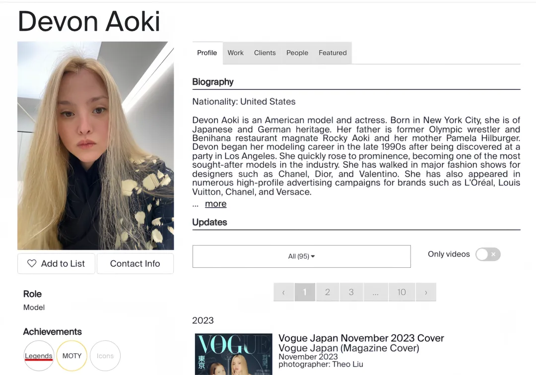 2024 年,她被业界最权威的模特排行榜 Models.com 评为“Legends 传奇超模”,也是这一榜单中,唯一拥有东方血统的模特。