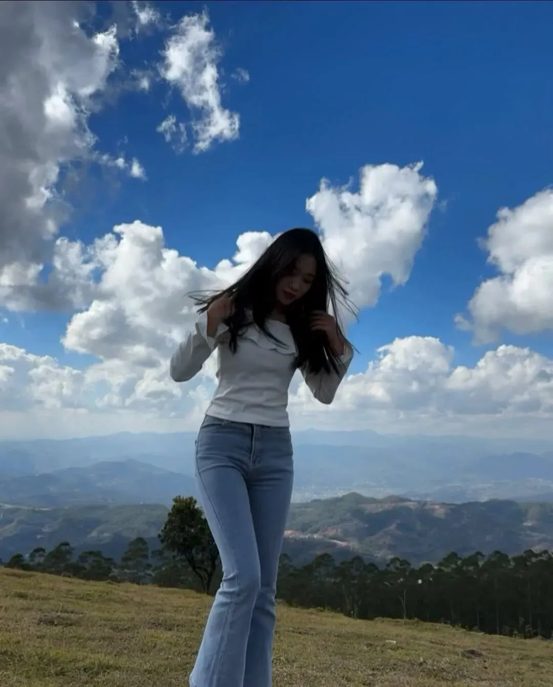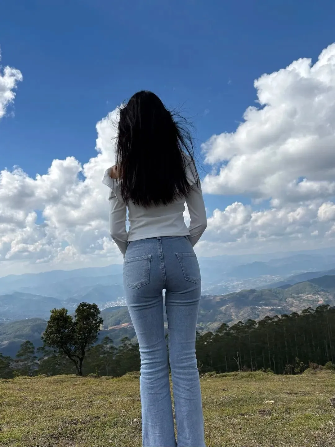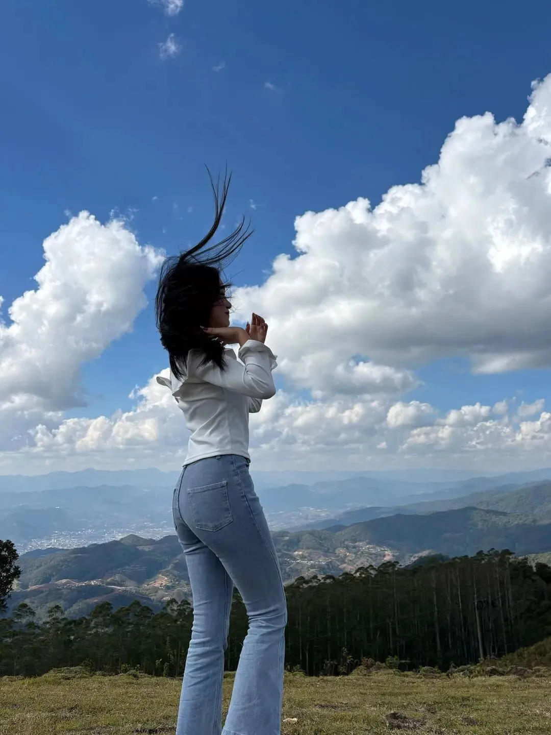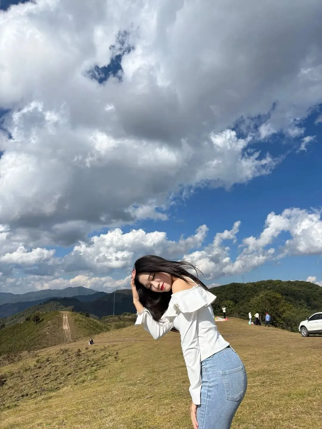 她站在山崖边张开双臂,山风灌满她的衣袖,牛仔裤的布料贴着她的身材曲线起伏,长发像黑瀑一样垂落。旁边停着一辆白色越野车,远处是层叠的山峦和棉花糖似的云海,让她多了几分野性的飒气。真正的“牛仔裤女神”从不刻意摆姿势,吹风、撩发、看风景,每个动作都带着“我负责美丽,你负责心跳”的松弛感。