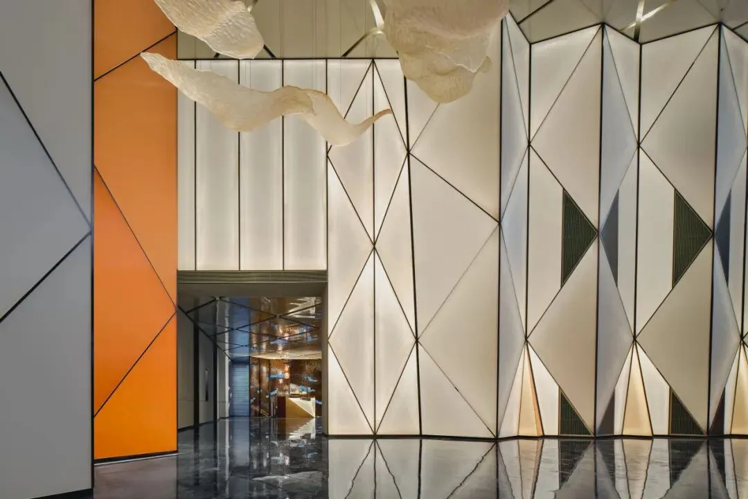 用 “材质、光影和动线” 转译自然感,比如大面积使用玻璃幕墙,让湖光直接映入室内,模糊室内外边界;地面用浅灰色石材模拟湖面肌理,天花板用曲线造型呼应湖岸轮廓;动线设计成 “迂回式”,搭配绿植景观,让行走过程像在湖边漫步,风的流动感则通过通透的空间布局和可开启的窗户实现,让自然成为空间的一部分。