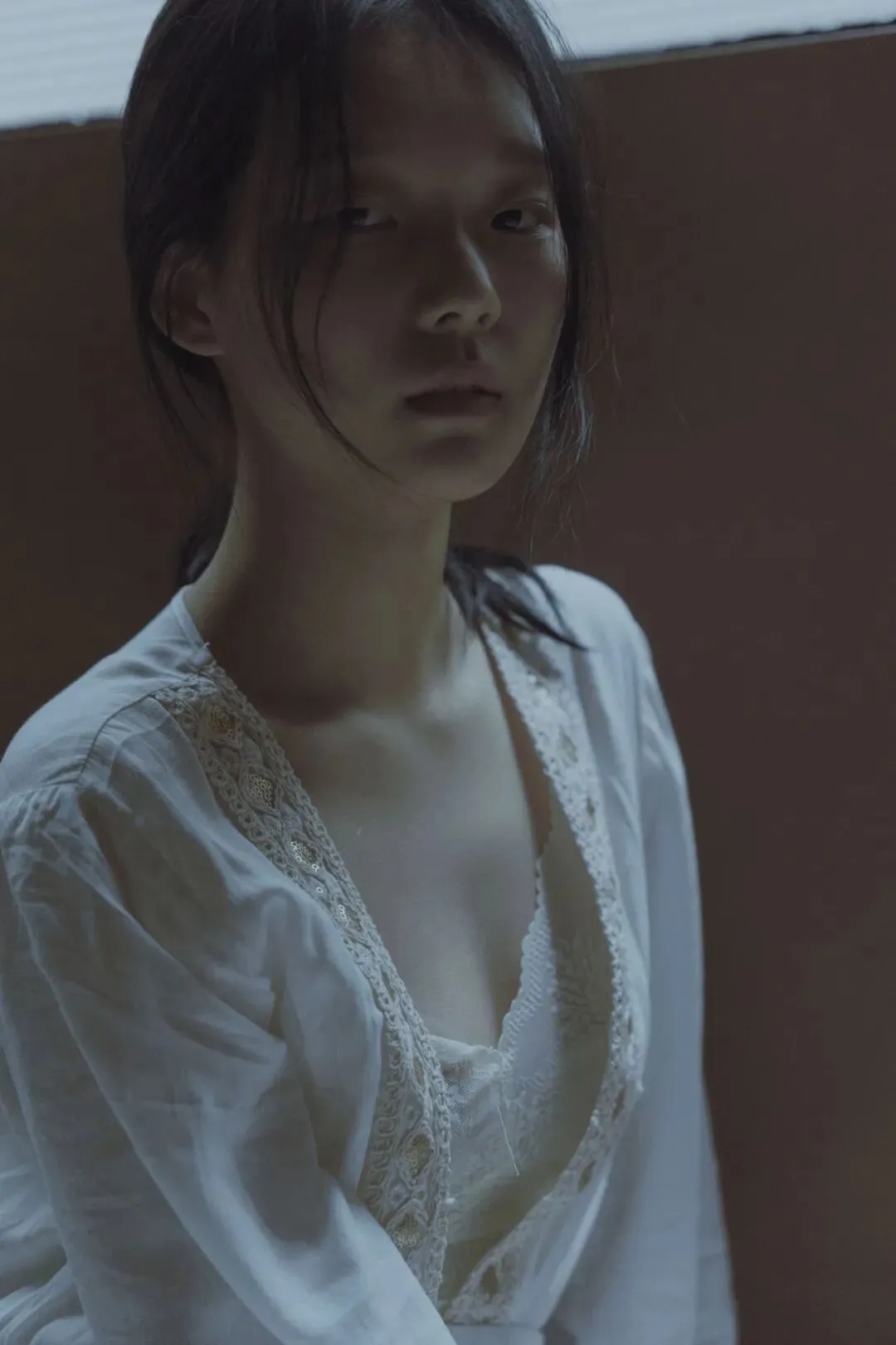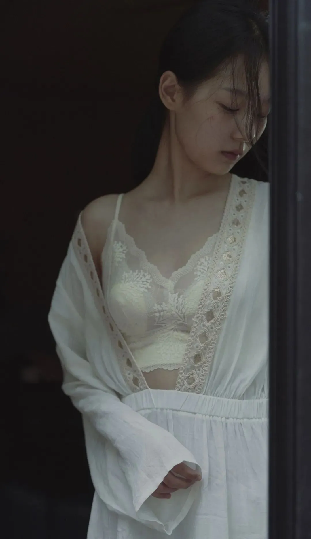 这组图走的是 “情绪氛围感” 创作路线。用室内的墙、百叶窗当背景,靠低饱和的冷调光影营造出安静又私密的氛围。情绪上是淡淡的疏离感,模特状态松弛又带点慵懒,蜷坐、抬手的动作自然得像日常发呆的瞬间。服装选了带蕾丝细节的白色宽松款,柔化了冷调画面的锐利感,又和整体的松弛感契合。光影是这组图的亮点,百叶窗漏进来的柔光裹着人物,明暗对比里透着细腻的情绪,把普通的室内场景拍出了故事感,像独处时的安静心事被悄悄定格。
