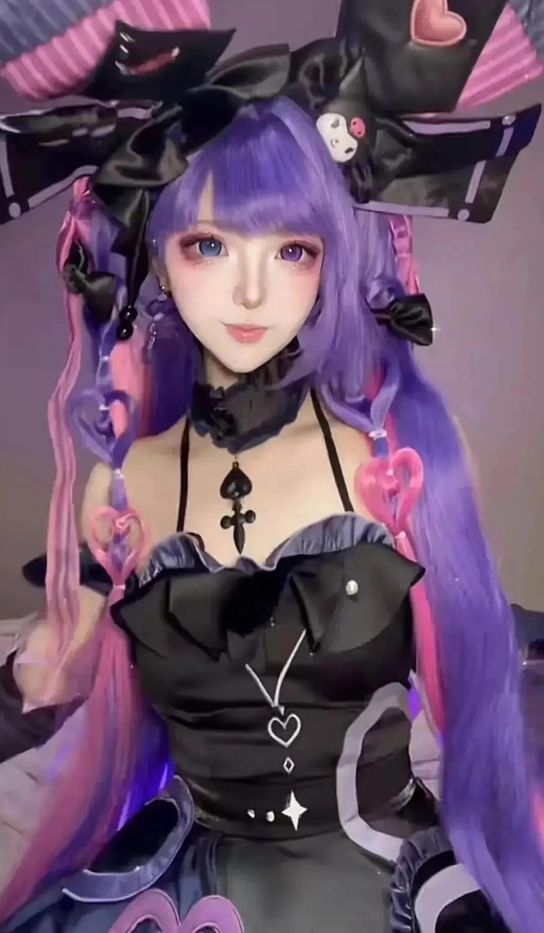 知名Coser铃木池将这款皮肤还原到了极致,她身着黑色精致衣裙,头戴紫红色长假发,异色美瞳一边蓝色一边紫色,眼睑下方存有粉色胭脂,这感觉既可爱又神秘。