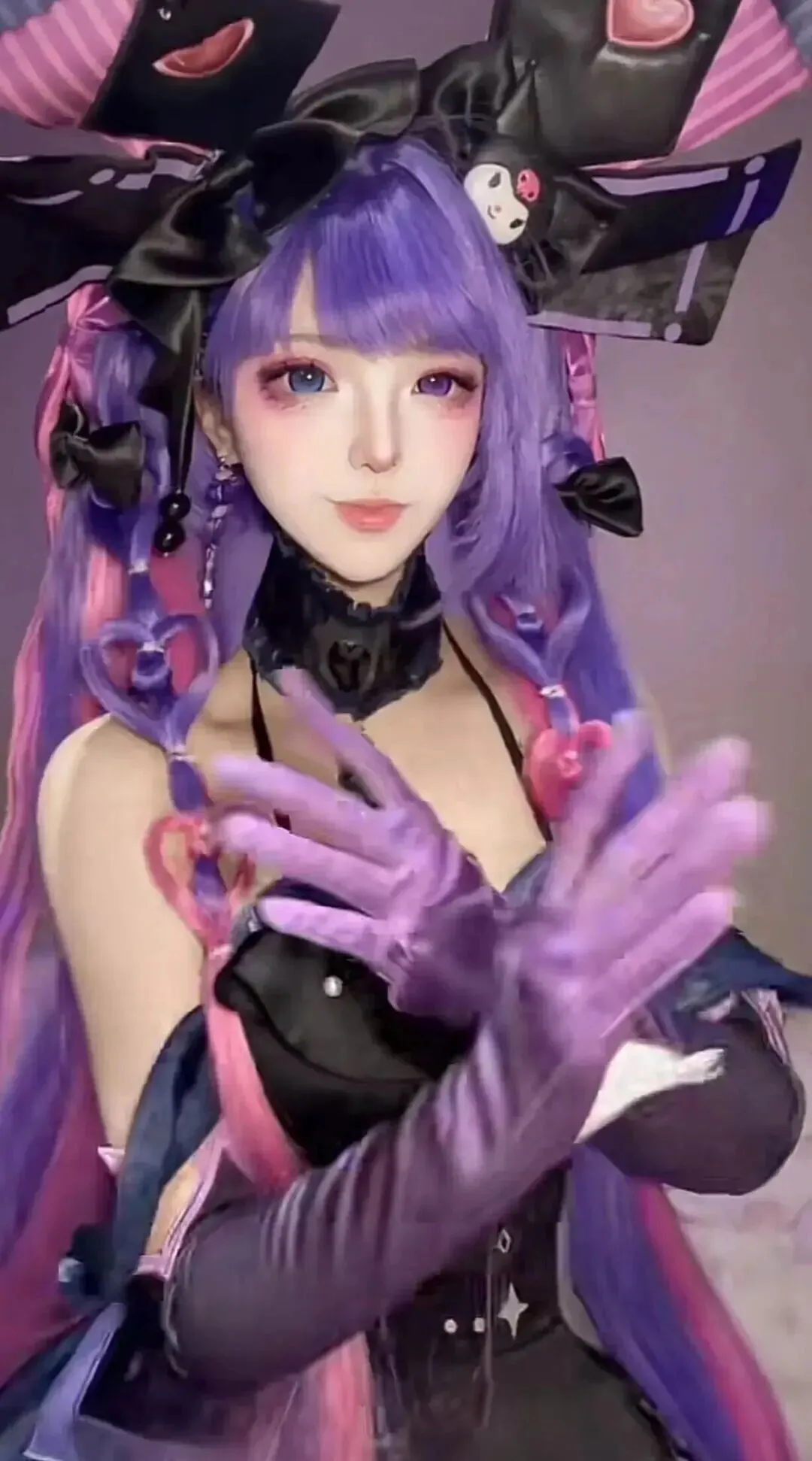 黑色头饰上坐着酷洛米玩偶,且带有爱心装饰,戴着黑色手套,皮肤白皙腰肢纤细,形象堪称完美。
