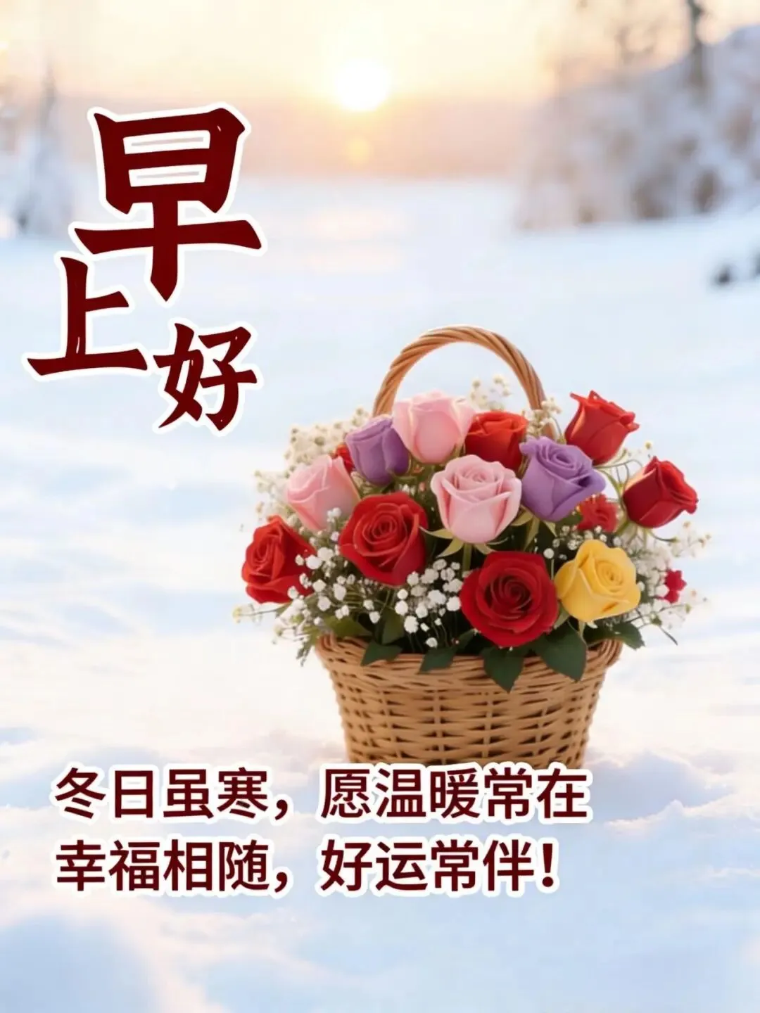 寒冬时节,天气愈发寒凉,我托那洁白无瑕的白雪,为您送去吉祥安康。先奉上健康这一无价之宝,再祝您幸福如滔滔江水,绵延万年长。季节更替,请您多珍重,愿平安时刻相伴,一同迎接温暖的春阳。早上好!🌹👌🌞💯☕️🎉❤️🙏☀️