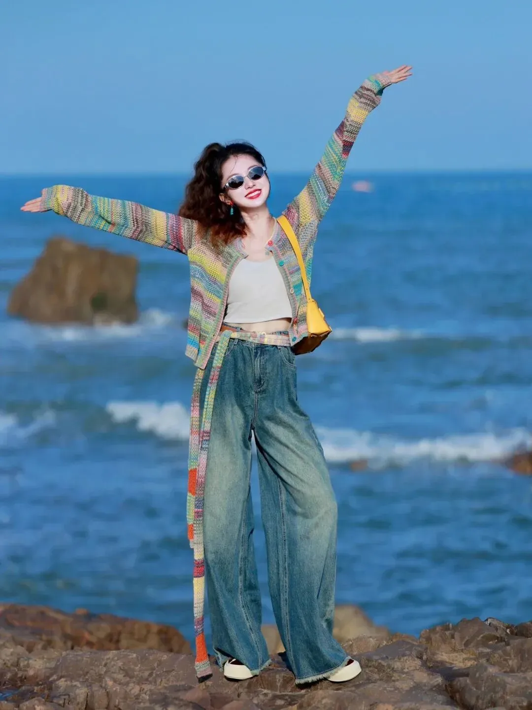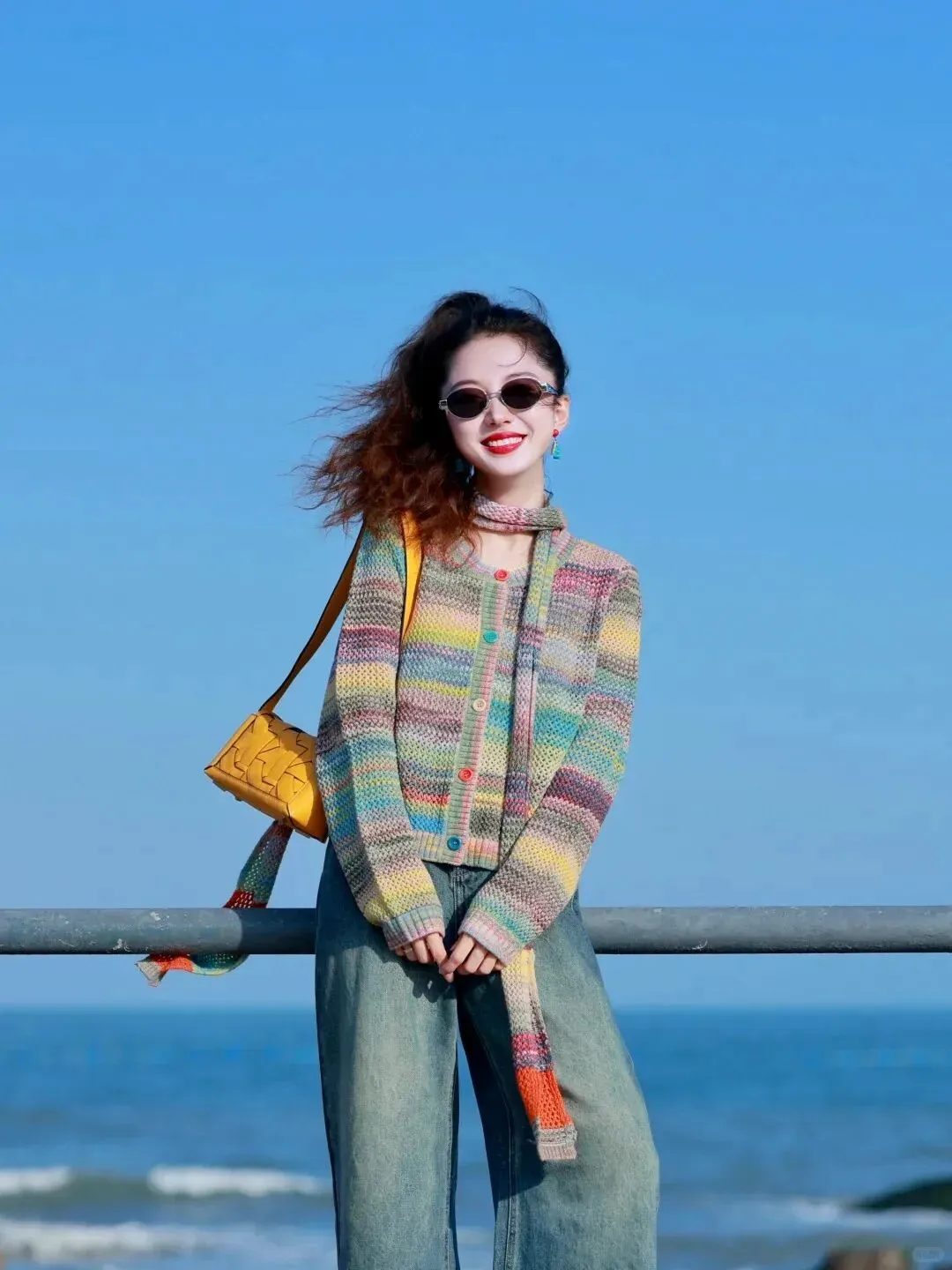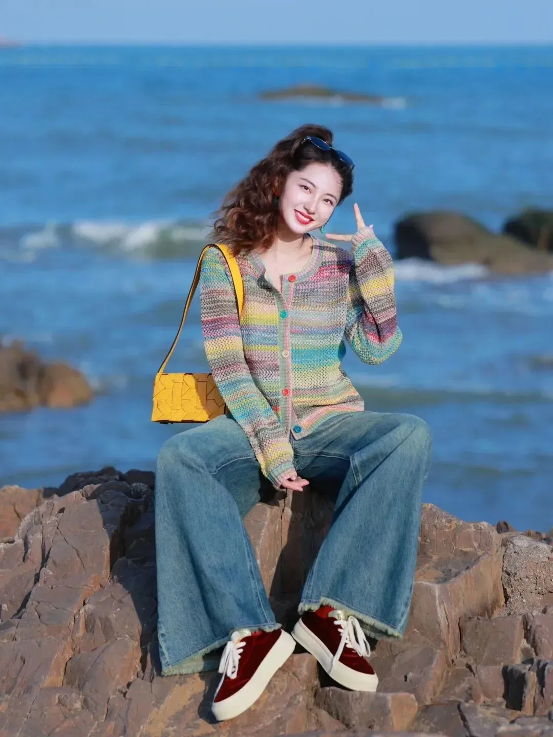 #春日OOTD# 阳光、海风、彩虹毛衣和牛仔裤,轻松演绎慵懒时髦感。搭配一抹亮色小包,释放青春活力,每一帧都是治愈系大片。海边的蓝天和笑容,是春天最美的滤镜。#海边穿搭#元气少女#