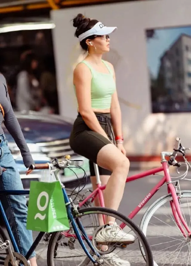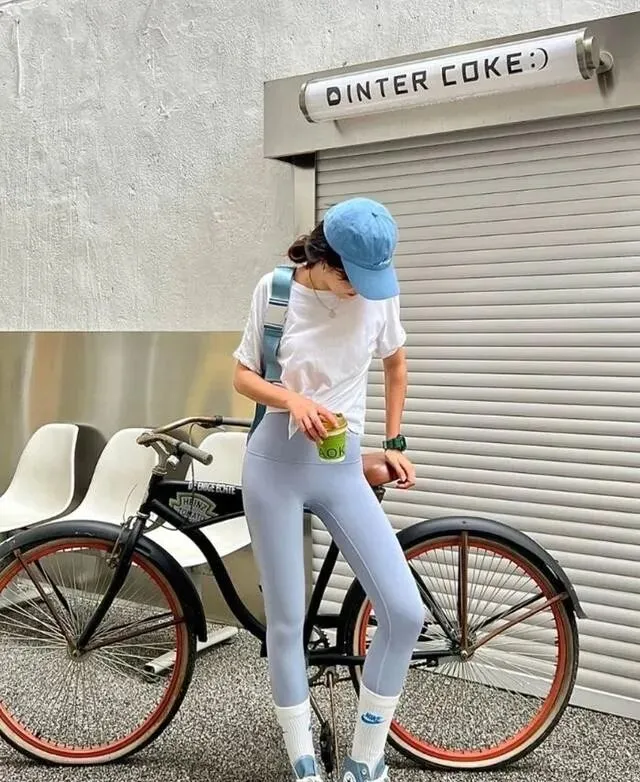 还有个原因 , 现在骑行特别流行对吧 , 满大街都是公路车山地车 , T恤配瑜伽裤刚好是骑行标配!