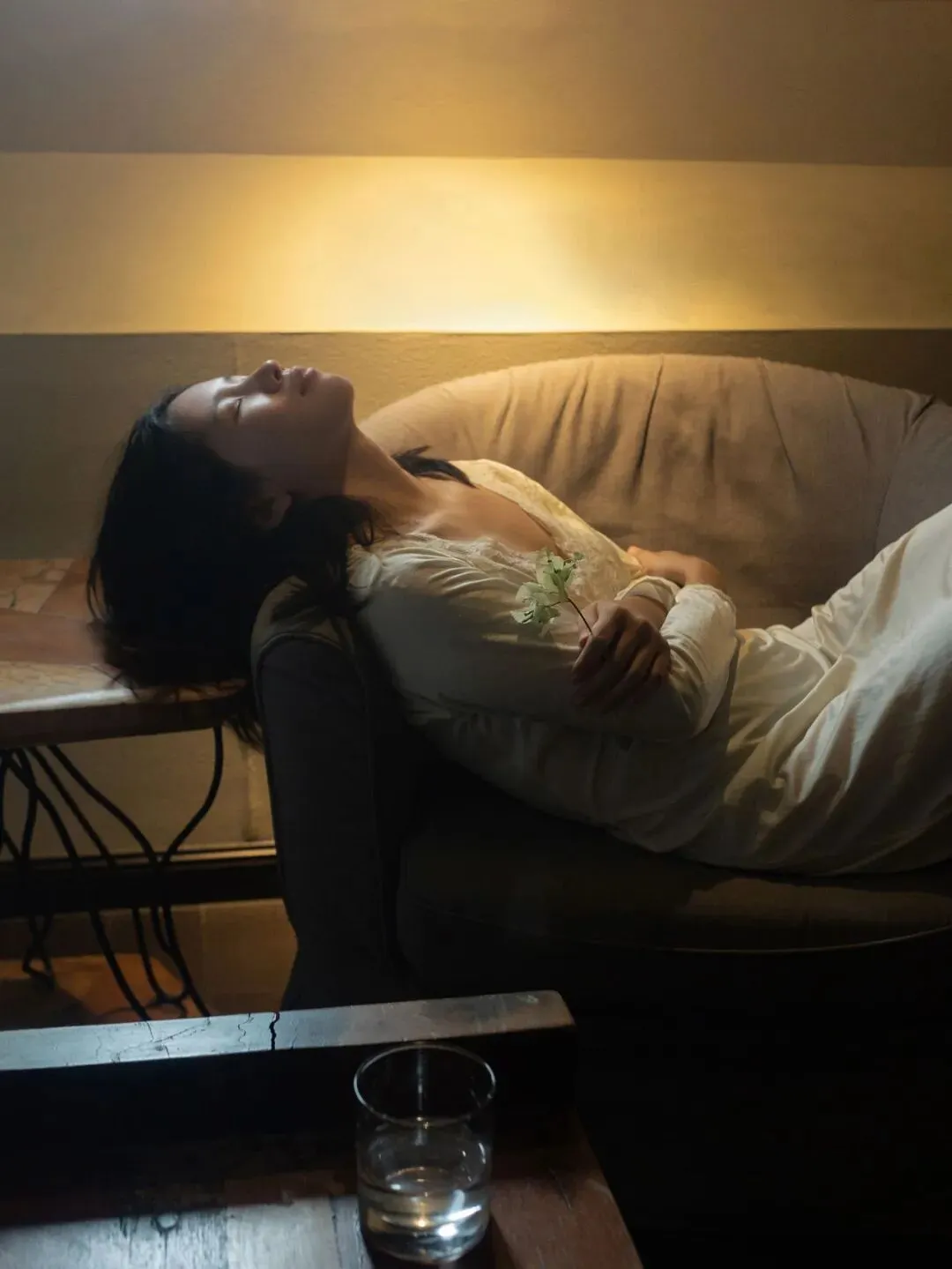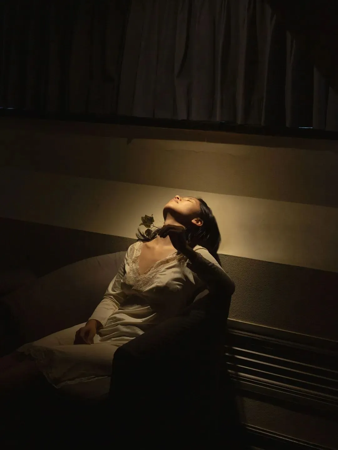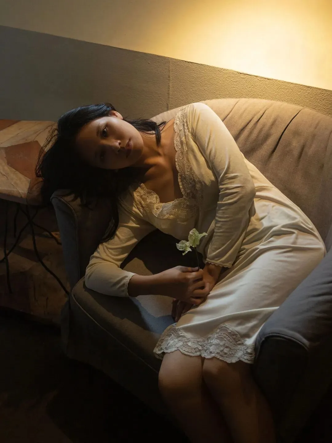 这组图走的是 “私密情绪” 路线,用昏暗室内作底色。这组摄影作品主打私密松弛的情绪表达,创作上以日常居家环境为载体,沙发、床榻的布置拉近了与观者的距离。光影运用很是巧妙,暖调柔光像一层薄纱笼罩画面,弱化了明暗对比,烘托出慵懒又私密的氛围。模特身着蕾丝白裙,肢体舒展松弛,或倚或卧,眼神半阖,将独处时的放空与惬意精准呈现。没有浓烈的情绪外放,只在淡淡的氛围里传递出温柔闲适的质感,整体观感舒适又治愈,很容易让人共情。