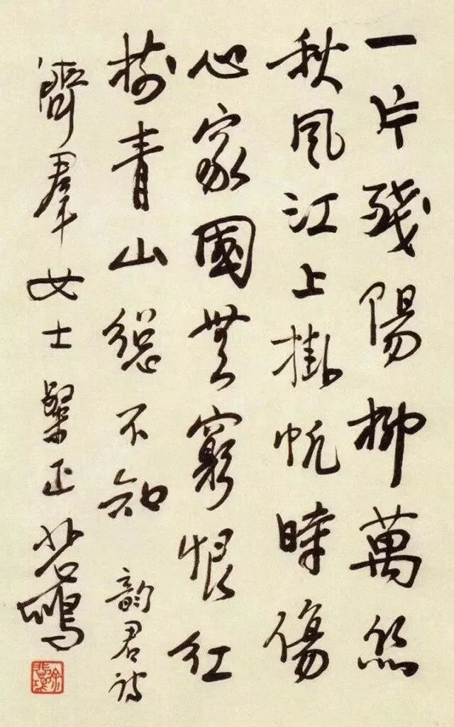 除此浓墨酣畅书写的大情怀,悲鸿书亦有小情调。譬如他书写的韵君女士之诗句:“一片残阳柳万丝,秋风江上挂帆时。伤心家国无穷恨,红树青山总不知。”此作结体清秀隽美,神姿飘逸。以帖之灵动摇曳,使诗中情感更显忧郁凝定,忽远又忽近。