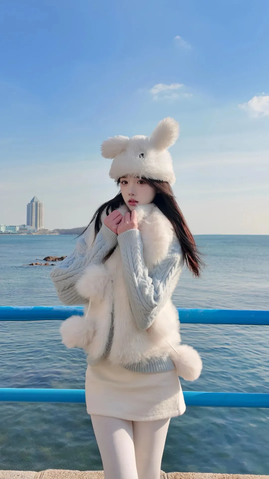 以白色和浅灰色为主色调,搭配少量粉色作为点缀,既保持了冬日穿搭的清爽感,又通过色彩的微妙变化增添了层次感。这种低饱和度的色彩搭配非常适合海边场景,与背景的蓝色大海形成了和谐的视觉效果。