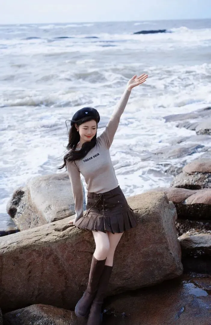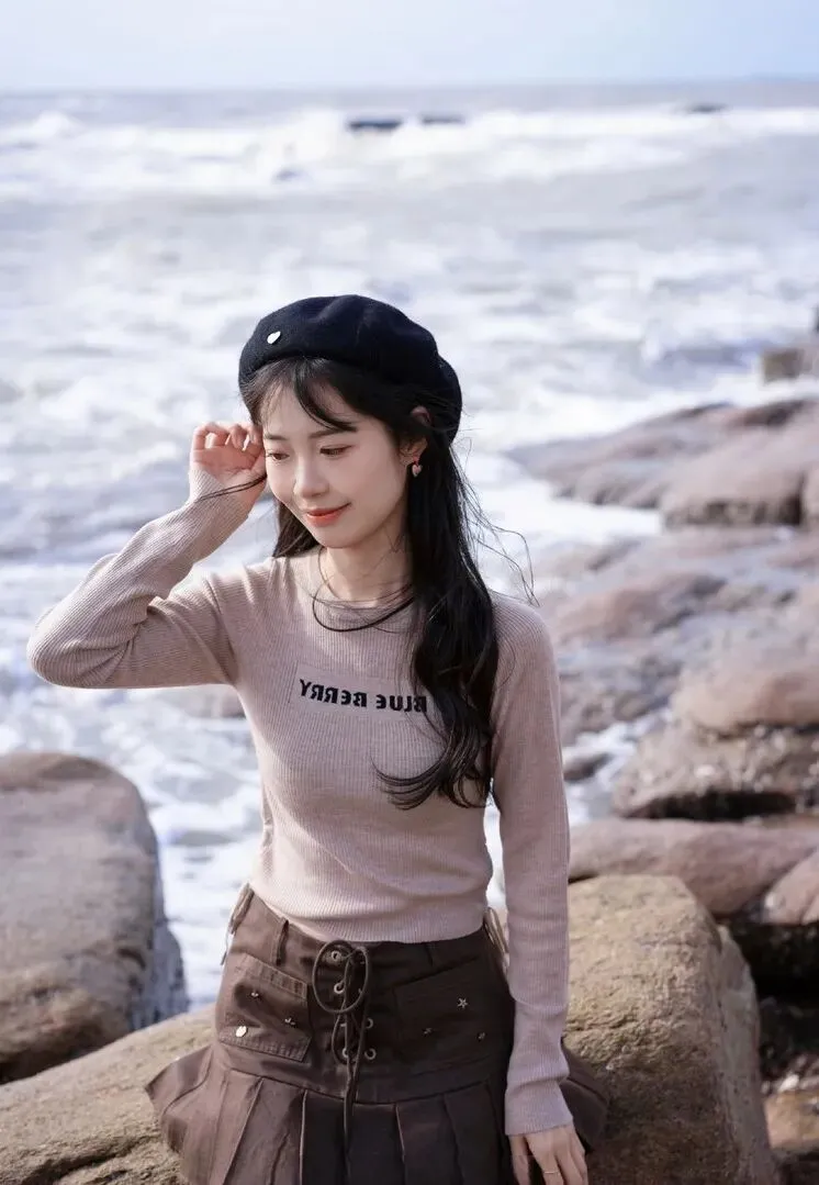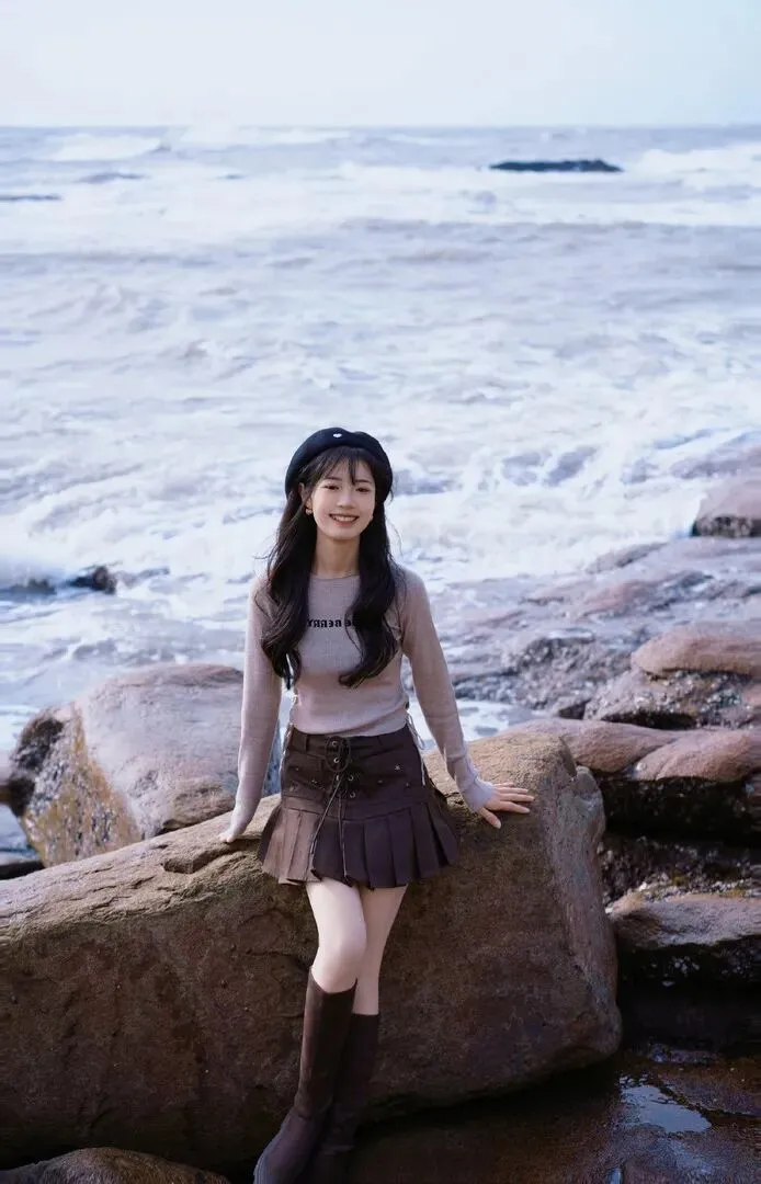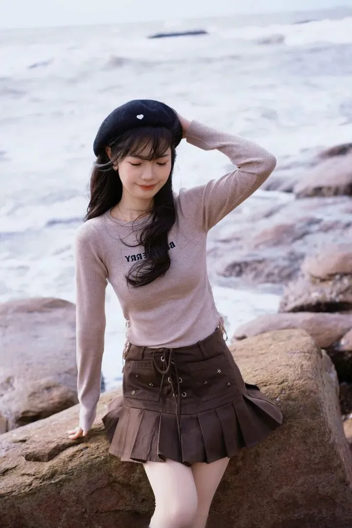.这套.穿搭走.的是温.柔又带点.俏皮的复古.学院风.,浅.卡其色针.织衫搭配深.棕色百.褶短裙,再.配上一.顶黑.色贝雷帽,.经典又.百搭.,完美适.配海边的清.新氛围。