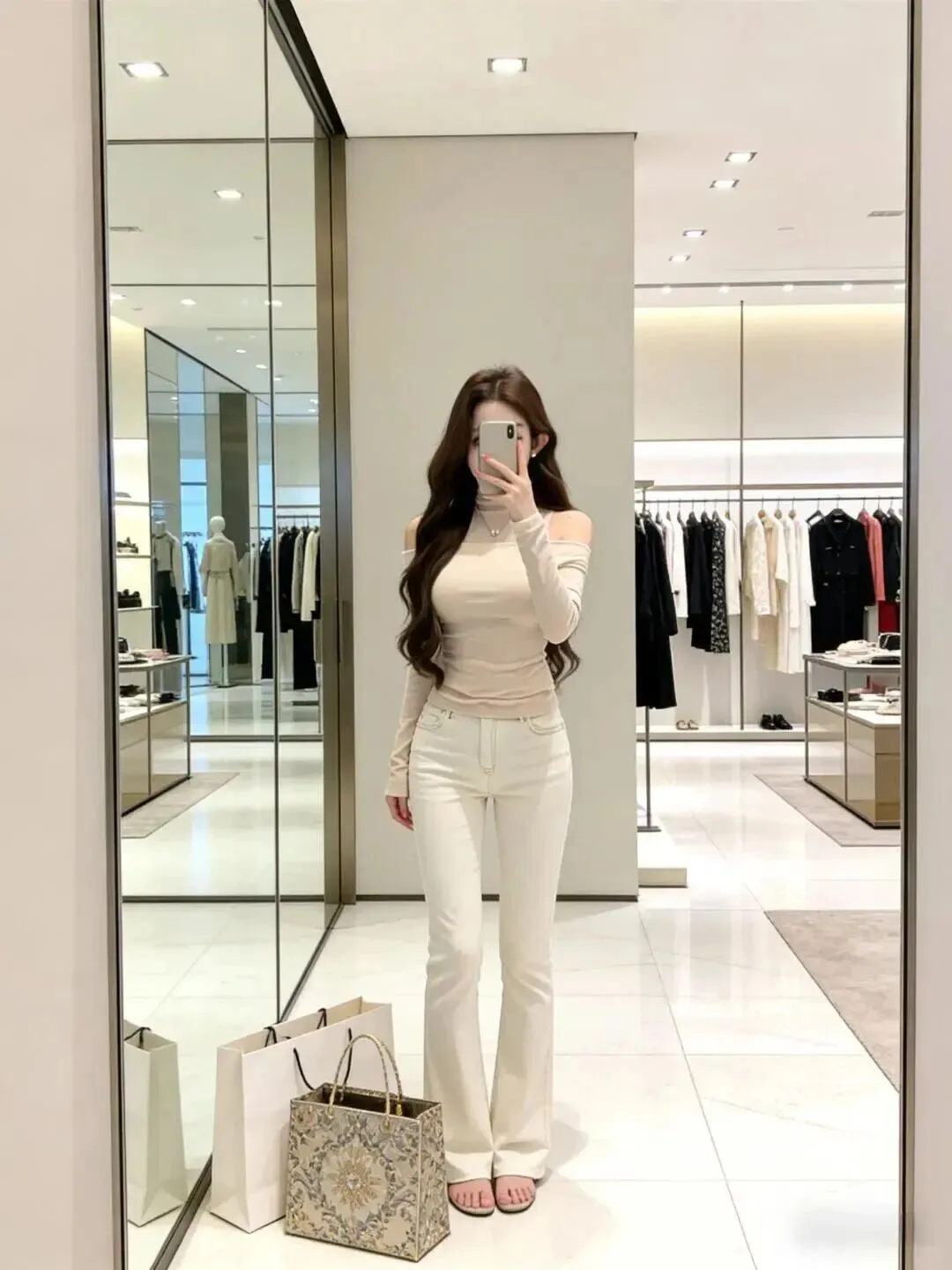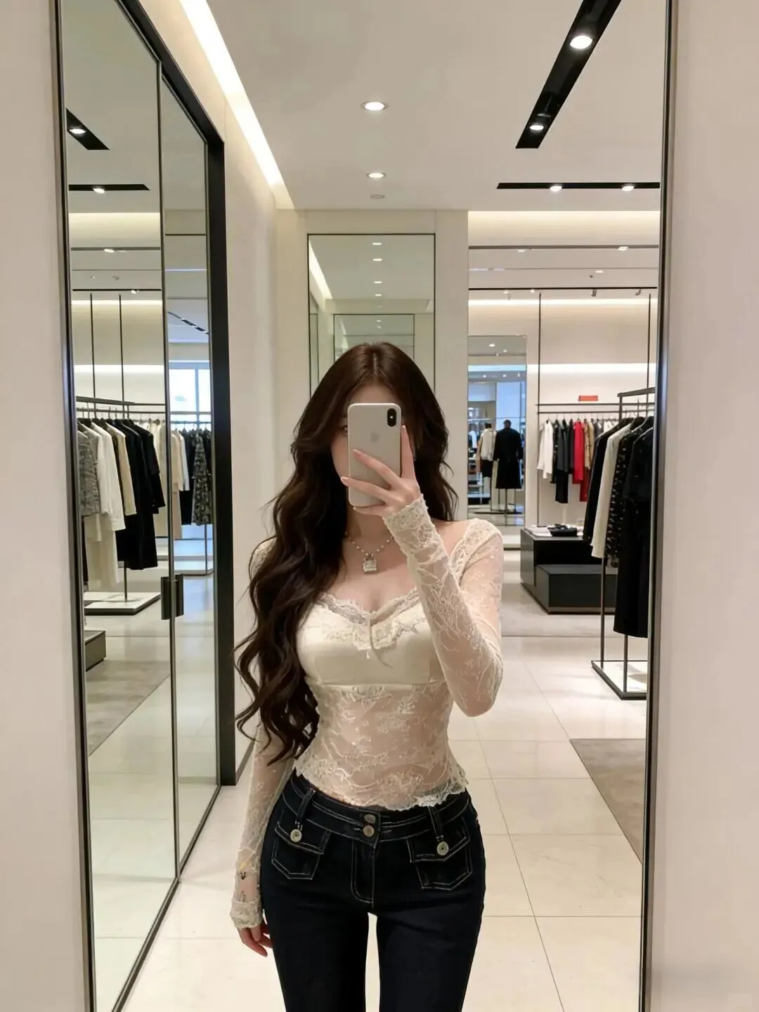 当前位置:首页>美女资讯>镜前试衣:蕾丝上衣与高腰牛仔裤的温柔性感穿搭