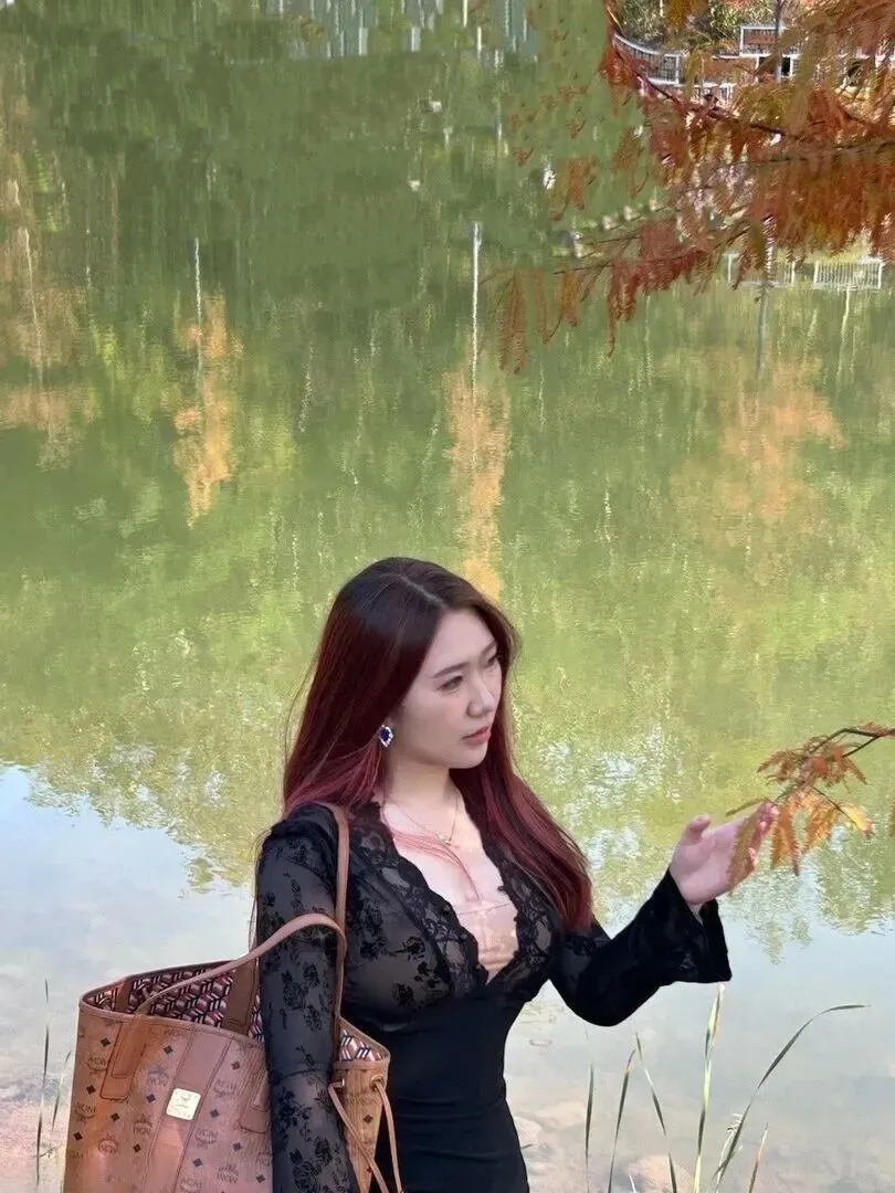 湖边.栈道被红叶.铺成.暖黄.色调,风一.吹过,叶子.就打.着旋儿落.到脚边。.这种时候.,穿一身.黑反而格.外醒.目——不是.沉闷的黑,.是带着呼吸.感的蕾丝.黑。她穿的.那条裙子,.长度刚过.膝盖,袖.口和.裙摆的蕾.丝花边随着.步子轻.轻晃,像.水面上漾.开的波纹.