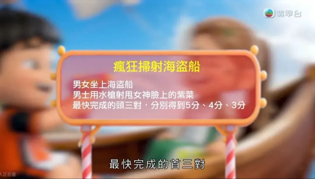 第一个游戏:疯狂扫射海盗船,女神脸上张贴着3张紫菜,男神使用水枪朝女神脸上喷水,最快把紫菜喷下来就有机会成为前三名。