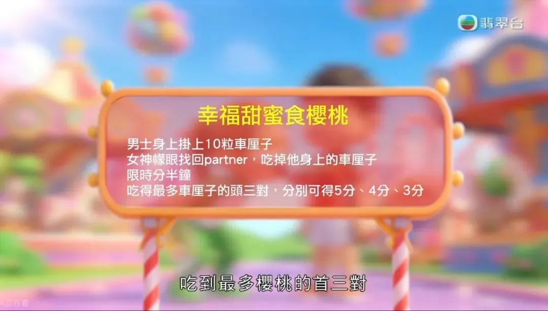第三个游戏:幸福甜蜜食樱桃。男神的脖子上挂着10颗樱桃,女神在1分30秒尽快吃樱桃,吃的数量越多分数越高,这次轮到女神转圈圈,樱桃个头也大,还得吃快一些,流出来的樱桃汁红色的,爱情就是呕心沥血的,颜色越鲜艳感情自然更好。