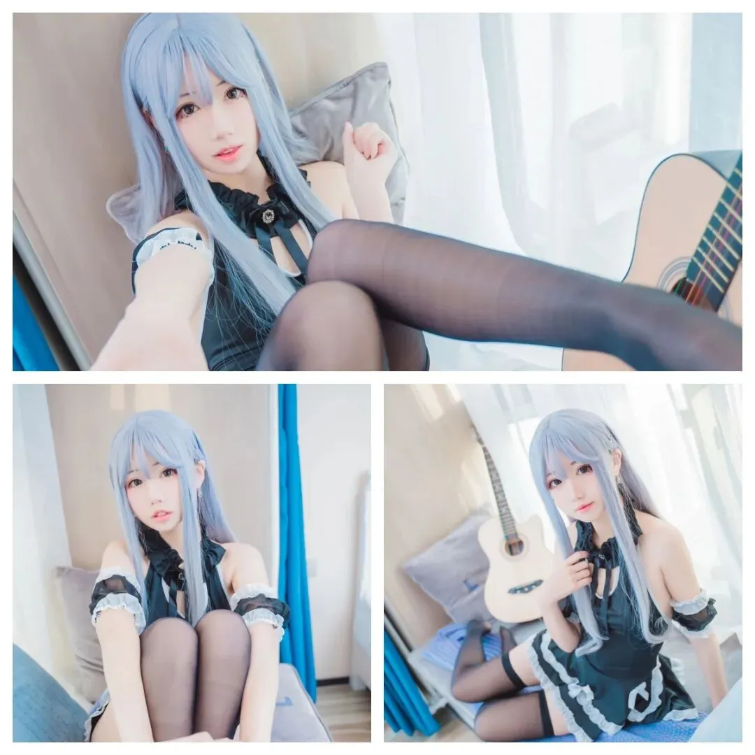 最爱她吉他的处理方式——木质的原色吉他配上蓝发黑丝,既有二次元的精致感,又带着点现实的柔美。吉他不是摆设,而是真的抱着,手指轻轻搭在弦上,眼神不是刻意的媚俗,而是带着点疏离的清冷感,仿佛是从漫画里走出来的暗黑少女,却又带着现实的温度。