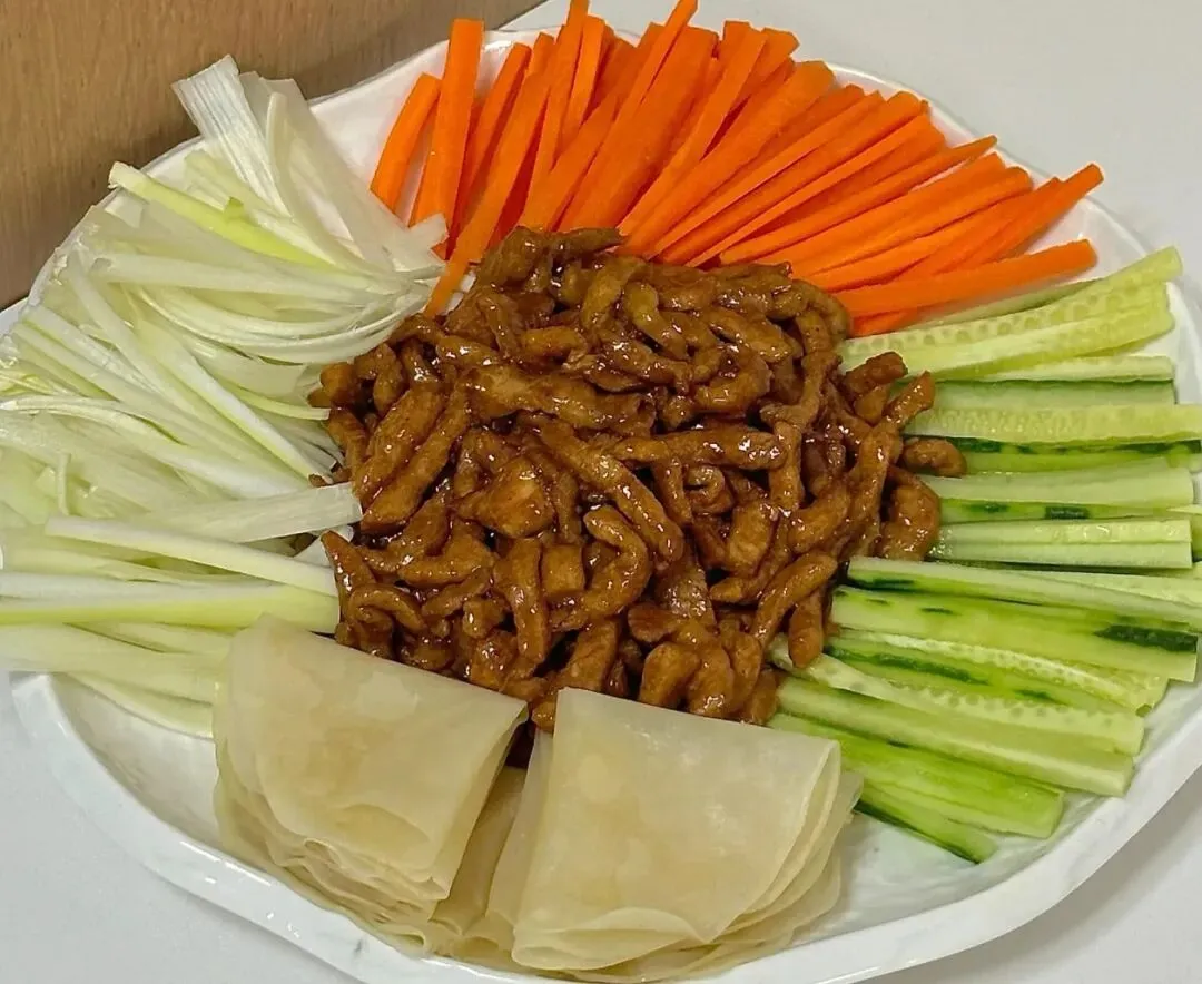 大盘中央铺一层葱白丝,四周摆上黄瓜丝、胡萝卜丝与焯好的千张块,再把炒好的京酱肉丝堆在葱丝顶端,红亮油润,与青白相映,分外诱人。食用时,先取一张千张或春饼,夹几缕肉丝,再配葱丝、黄瓜丝卷成筒状,一口下去,酱香、肉香、葱香与清爽的蔬菜交织,层次丰富,回味悠长。若配米饭,可将酱汁与米饭拌匀,酱香裹住每粒米,同样令人食欲大开。
