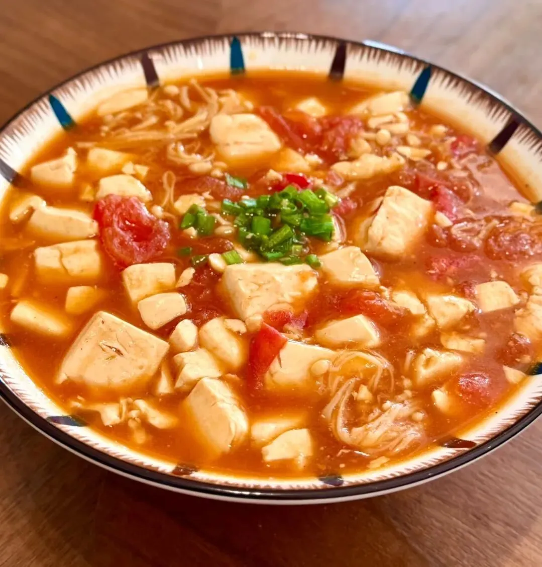 1️⃣蒜末,小米辣炒香,番茄加生鲜炒出沙,2️⃣一碗淀粉水煮开转小火,下豆腐炖煮,加生抽,蚝油,盐翻炒