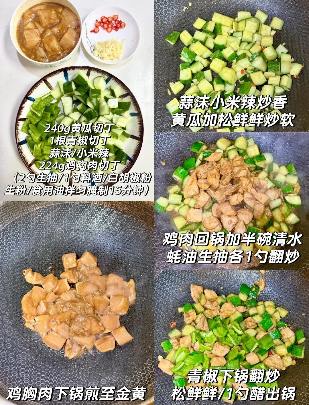 1️⃣鸡胸肉切丁,腌制一下,鸡胸肉下锅煎至金黄捞出,加蒜末,小米辣炒香