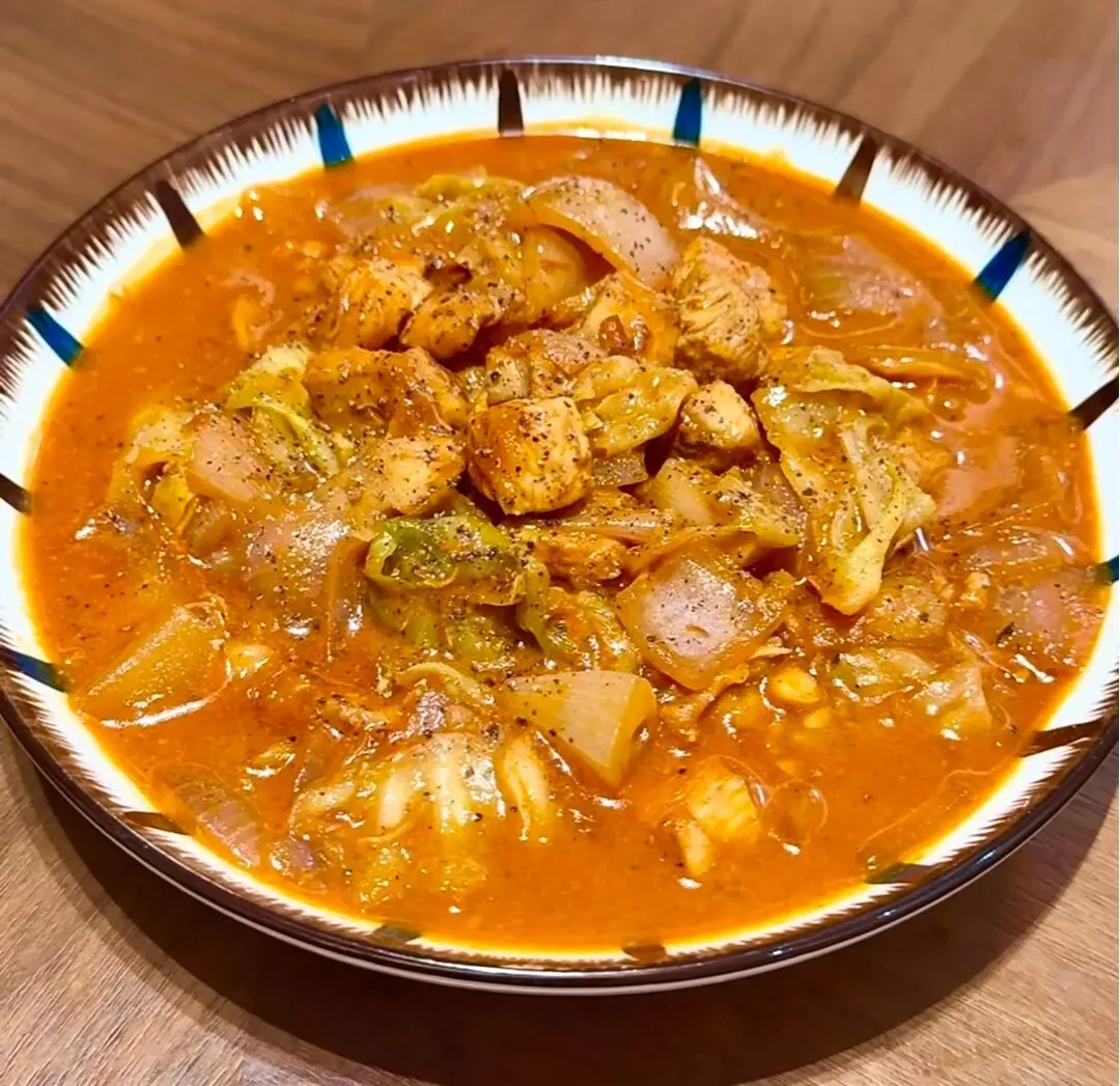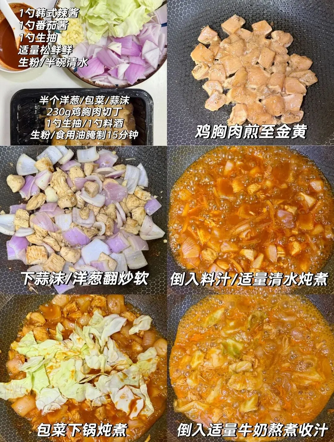 3️⃣倒入料汁,适量清水炖煮,放入包菜下锅炖煮,倒入牛奶熬煮收汁出锅