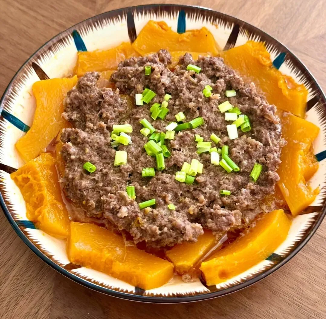 2️⃣牛肉平铺在南瓜上,再蒸10~15分钟,出锅撒点葱花