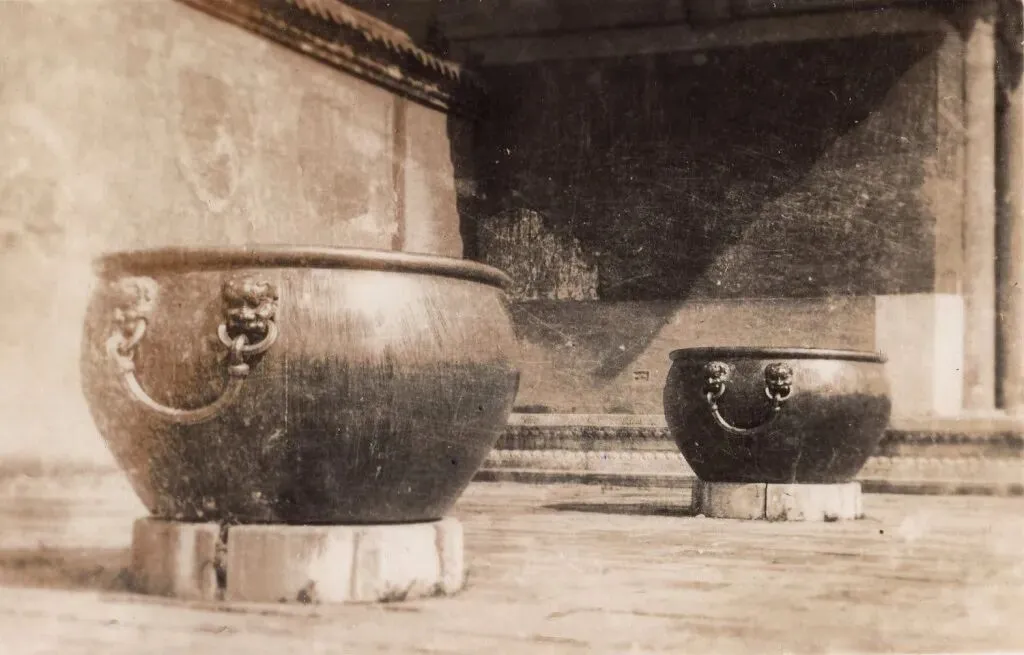 民国时期,故宫太和殿两侧陈列的鎏金太平铜缸,最初的意图是用来防火。明清时期,这些大缸平时里都要贮满清水,宫中一旦失火,就可就近取水灭火。