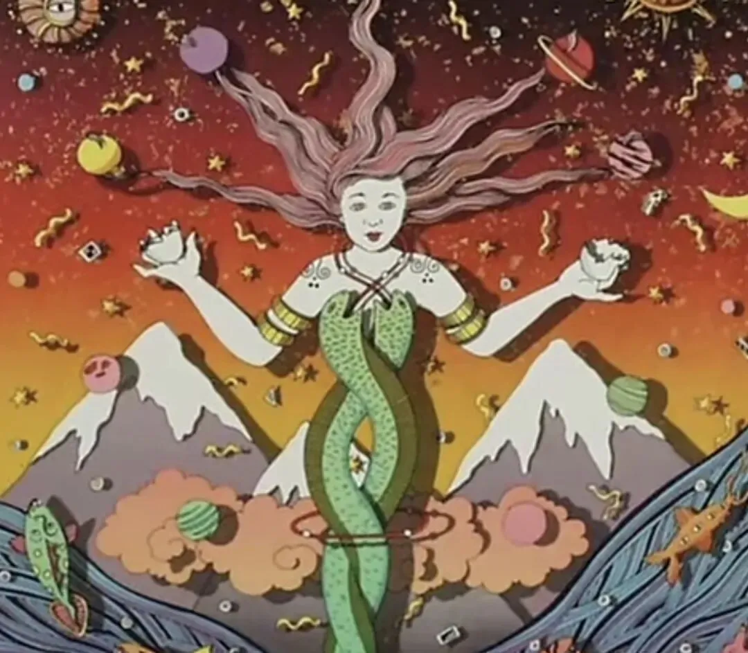 这念头重得很,需得大地的骨骼来承托。瑞典的莫妮卡·怀厄,以学术的铆钉,为我们拼接起“宇宙大母神”散落的遗骸。而在华夏的考古层里,我窥见了女神从蛙到蛇的嬗变。蛙鸣哇哇,似婴儿初啼,“娲”之本源,原是生命破开混沌的第一声宣言。这丰腴的、生殖力蓬勃的意象,随着涿鹿战败者的迁徙,或是大洪水后幸存者的远足,向西漫漶。途中,她遇见了黄帝部落的龙蛇崇拜,形态渐而修长、神秘。在古印度哈拉帕的陶俑上,她是乳房饱满的陶偶;随着商队的足迹,她渗入两河流域的湿泥,在苏美尔的楔形文与巴比伦的史诗里,变幻为伊什塔尔,为伊斯塔,为一切司掌爱、战、生殖的强悍女神。音讹了,形变了,庙宇倾颓了,但骨血里那孕育、舞蹈、给予生命的阴性力量,那与月相盈亏、潮汐涨落、草木枯荣同呼吸的古老感知,或许从未真正断绝。她只是沉潜了下去,沉入集体无意识的黑海,偶尔在梦的波纹里,露出蛇一般粼粼的背脊。