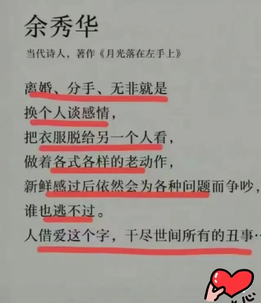当代诗人余秀华有一部作品,著作《月光落在左手上》,见上图。理是这么个理,但是被她这么写出来,却感觉别有一番滋味。很多文章写了如何相爱,却没有写我们应该如何好好告别.有一天你被分手了,失去这份感情你该怎么做。如果回不到过去,那么放下就是最好的,还爱着就在一起,不爱了,就说声,你好,再见。