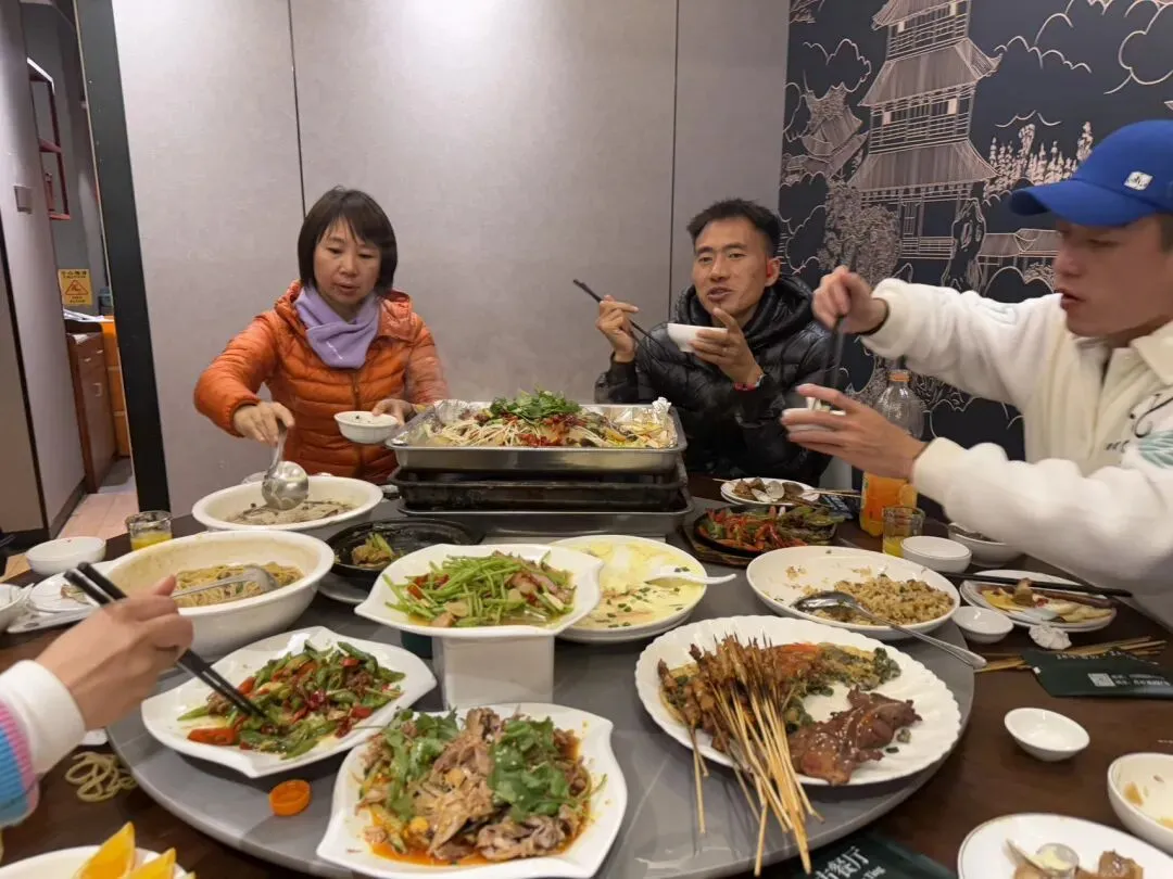 我在酒店门口办理入住时刚好一个跑者刚跑完步从外面进来,一身运动装扮,皮肤黝黑,肌肉结实,小腿肌肉线条紧致,一看就是资深跑者,我随口问了一句:“你好,冒昧问一下,你是A区破3大神吧?”,他微笑着点头,似乎还带着一丝害羞。他问我从哪里来,我回答说“重庆”,他立马把手机递给我看,说刚碰到了一个重庆的妹子,把我拉到了这个群,说邀请了他一块吃晚饭,我定睛一看,这不是我们追光跑团厦马小分队的交流群吗?瞬间我明白了,他说的那个重庆妹子就是芳芳。他告诉我他是“贵州小跑”然后到前台取了钥匙🔑回房间,我才发现原来他就住在我们隔壁。