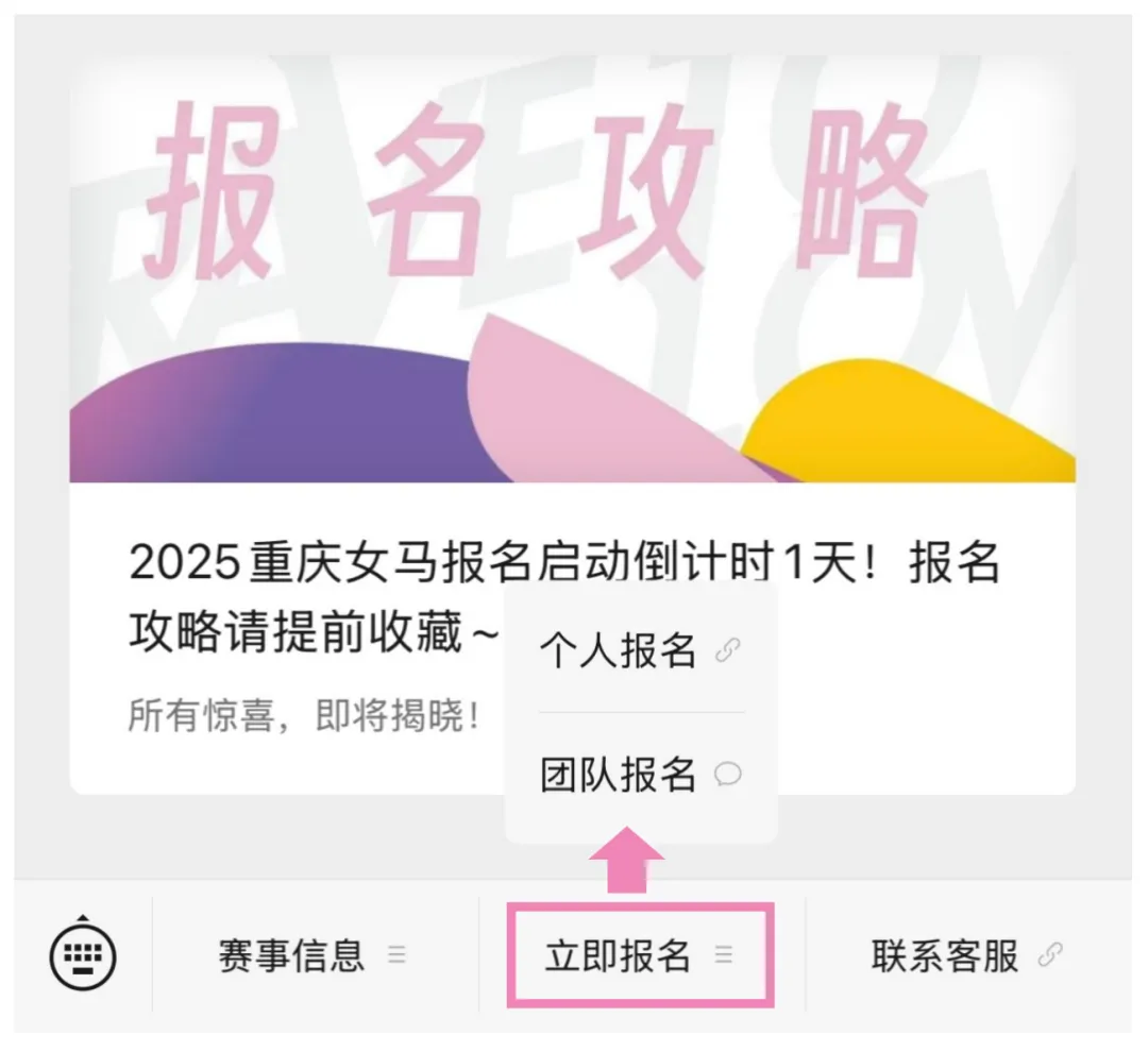 方式一:关注“重庆女马”微信公众号 ➡️ 点击菜单栏“立即报名”。