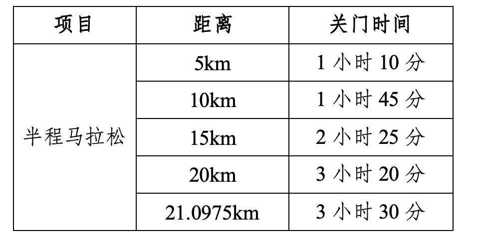 为保证参赛运动员赛时安全,限时对社会交通进行滚动封闭。比赛路线各段专设有赛时关门时间。关门时间后,相应公里点的计时毯停止工作,相应路段将恢复社会交通。在规定关门时间内,未跑完对应距离的参赛运动员必须听从裁判员指挥,立即停止比赛,退出赛道,以免发生危险。退出比赛的运动员可到沿途收容站搭乘收容车或自行选乘公共交通抵达终点或向赛道裁判志愿者求助。如遇特殊情况,组委会有权决定提前关门,参赛者须服从组委会安排。关门时间按发枪时间计算,具体见下表:
