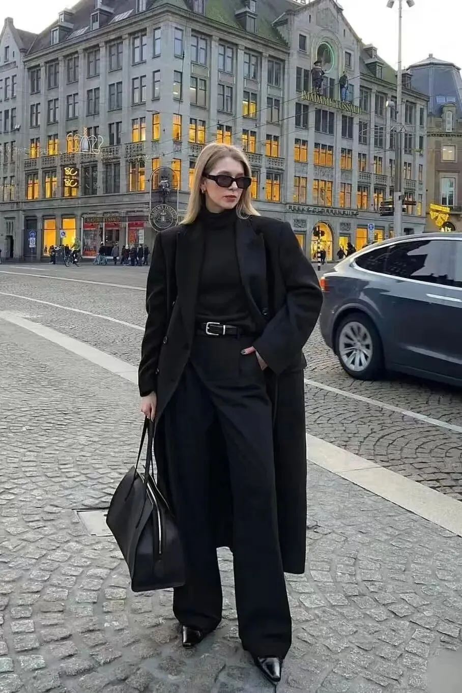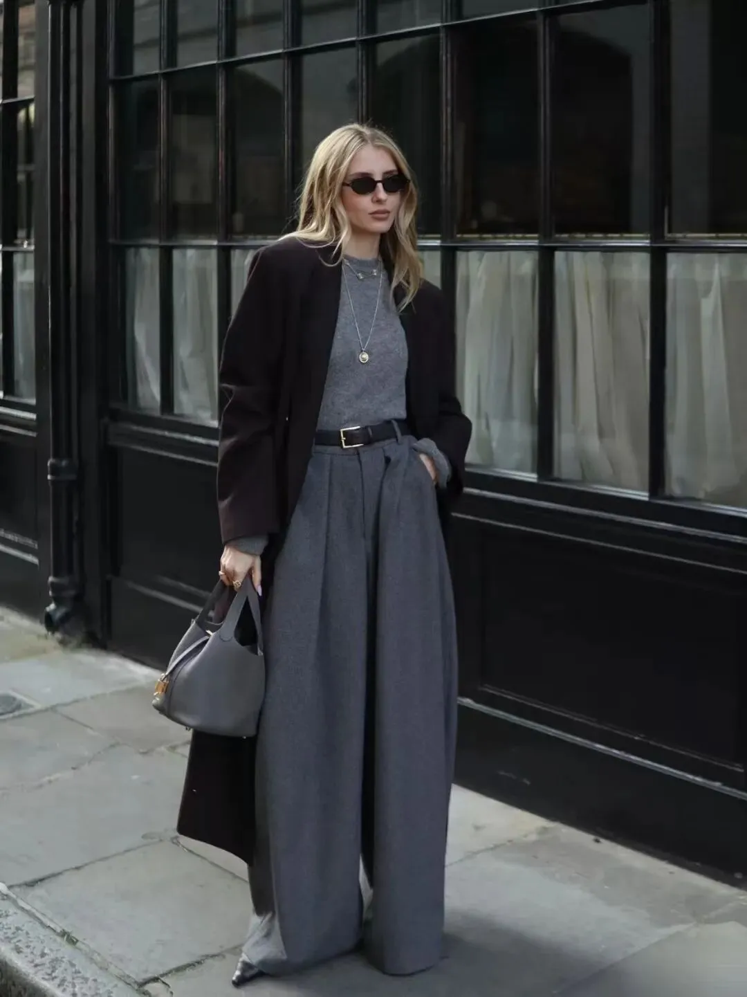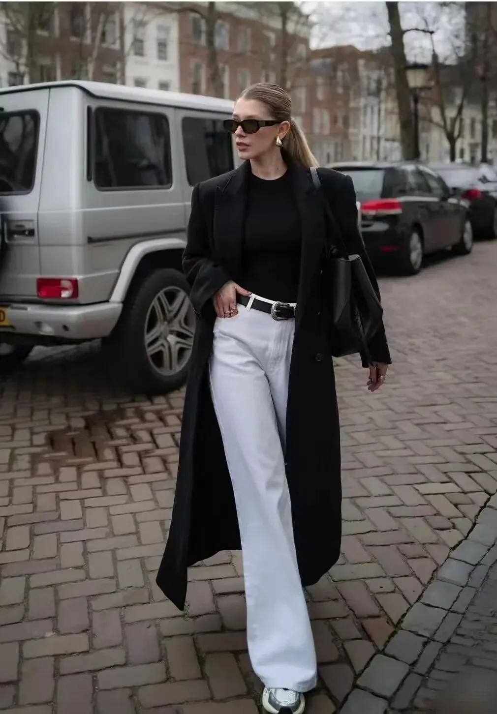 内搭颜色最好和下装统一,或者把上衣扎进下装里,无论是全塞、半塞还是只塞前面,务必露出腰线,外套敞开穿,形成连贯的纵向线条。