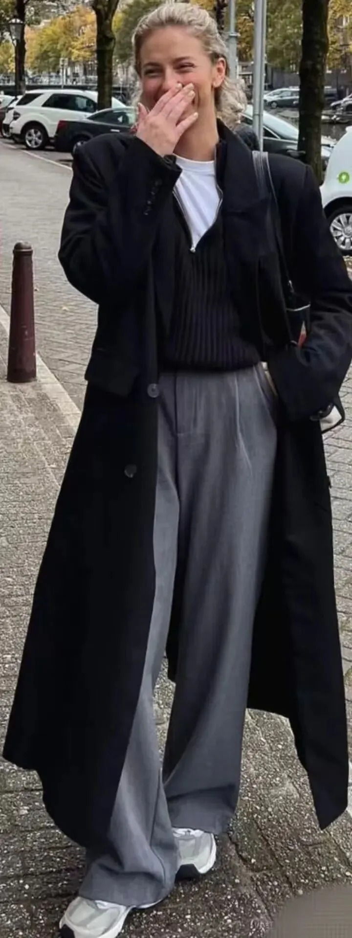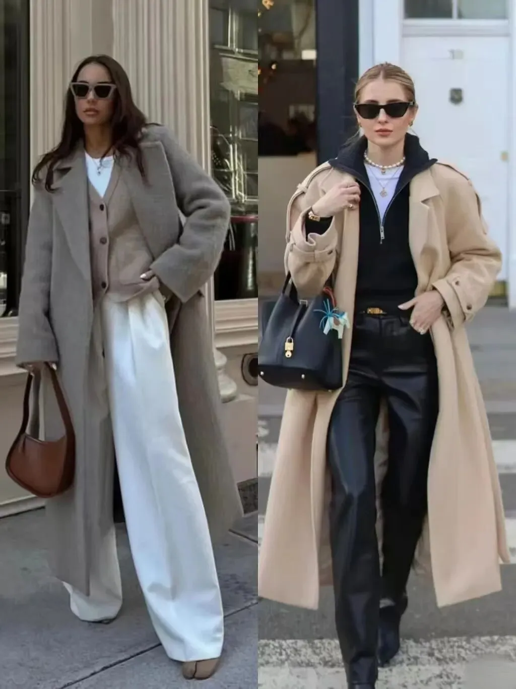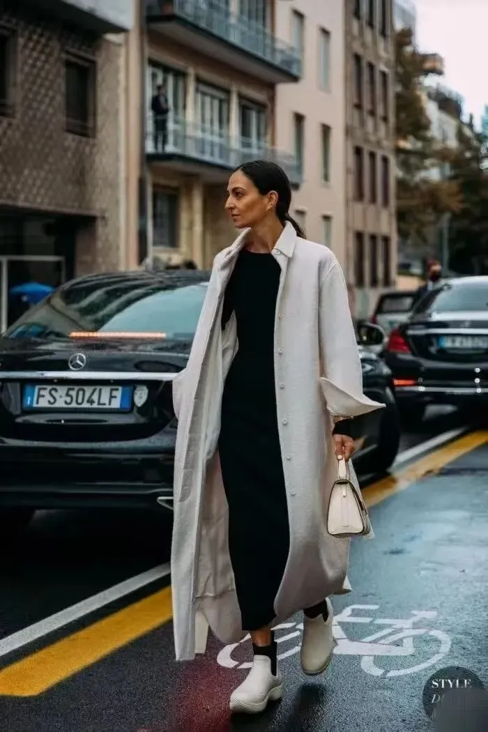 如果真的要穿长款大衣,请选择利落剪裁的款式,比如显腰线或有腰带的X型大衣,H型大衣,要避免廓形款式。