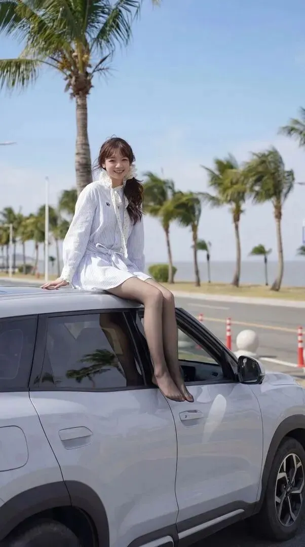 .她拍照的.姿势.也很值.得学学。.一只手轻.轻撑在.车顶.上,.双腿自然并.拢,.既显腿长又.不会显.得做作。.后面.的棕榈.树和公路当.成背景,.整张.照片就像电.影画面一.样。