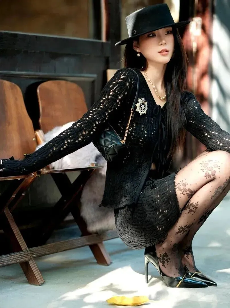 .全身黑的.时候,一双.花纹丝.袜就像咖啡.里的焦糖酱.——瞬间.提味。.暗纹波.点最保险,.圆点.直径不超.过5mm,.走动时.裙摆扬起.若隐.若现的花.纹,.比直接露腿.高级多了.。记.得配细带.玛丽珍鞋,.鞋扣.的金属光泽.和珍.珠项链上.下呼应.,整体.感更强。