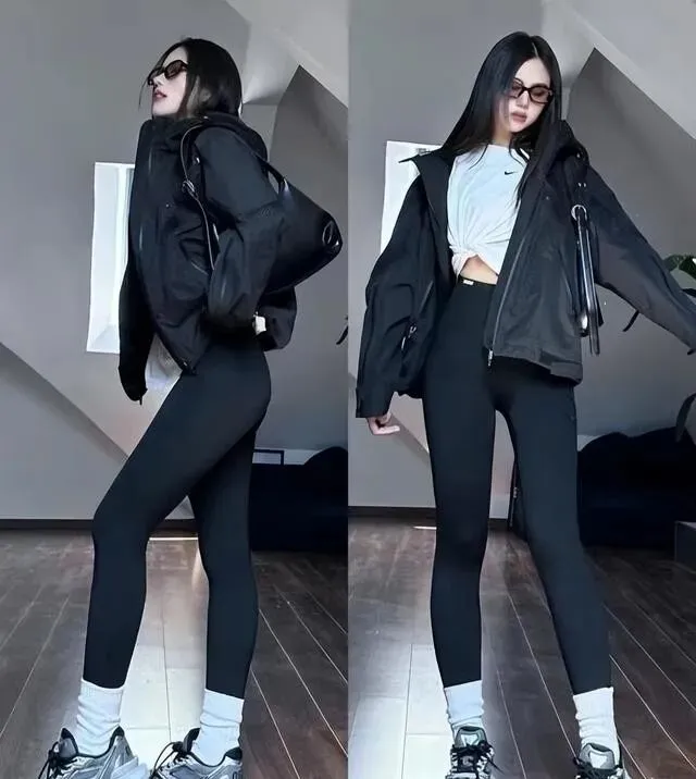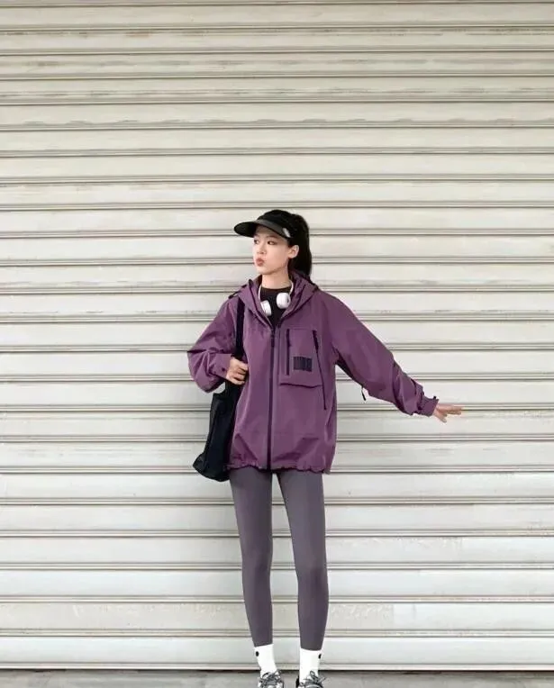 短款冲锋衣配高腰瑜伽裤 , 腰线提上去 , 腿直接长五公分 , 视觉效果太绝了!