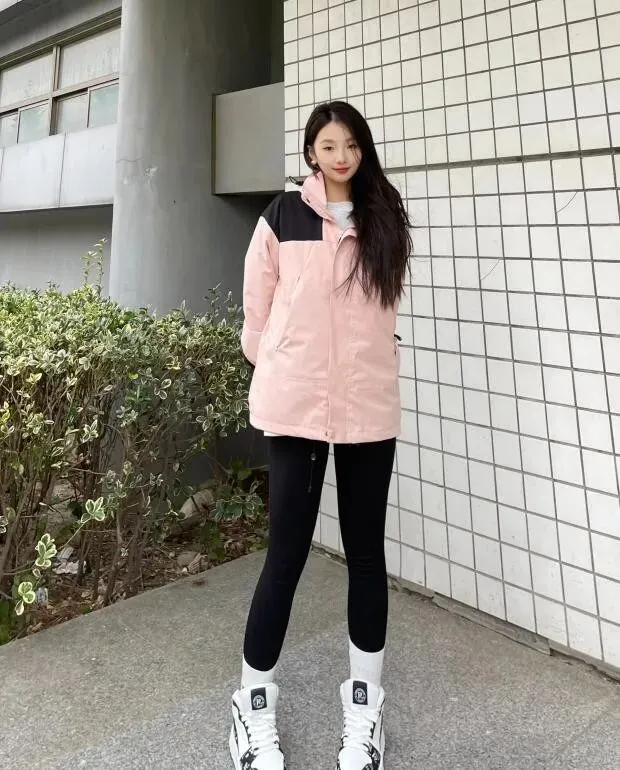我仔细观察了一下 , 发现这套搭配确实有点东西。 冲锋衣轻便 , 瑜伽裤显腿 , 两个加一起 , 保暖和时髦全占了。 难怪杭州女生人手一套~