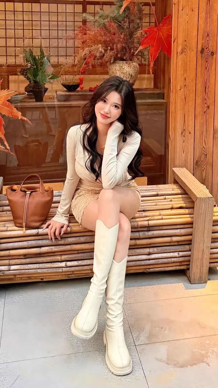 米黄色的长筒靴是麂皮的,颜色比上衣和裙子深一点,更接近卡其。靴筒高到膝盖下方,紧紧包裹着小腿,在脚踝处收窄。靴跟不高,大概三厘米,走路不累,但足够让腿看起来更直。头发披散着,没打理,下午洗过,发尾还带着湿意和护发素的香气。几缕碎发粘在颈侧,她没有拨开。“一位吗?”服务生走过来。她点头,跟着走到角落的位置。坐下时很小心,先用手拢住裙摆,慢慢坐下,双腿并拢侧向一边。这个姿势优雅,但大腿内侧的肌肉需要一直绷着,保持线条。蕾丝裙摆因为坐姿而往上提了一点,靴子的上缘露出来更多,能看见靴筒边缘精致的缝线。等待的时候,她环顾四周——典型的港式茶餐厅,卡座是墨绿色的,桌面是浅黄色的大理石,已经有些划痕了。墙上贴着褪色的菜单和旧海报,风扇在头顶缓慢转动,影子在桌面上一圈一圈地扫过。