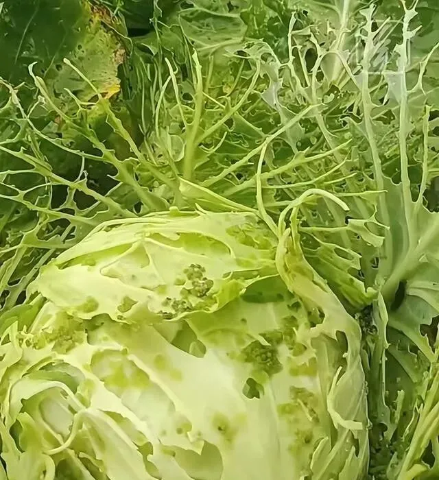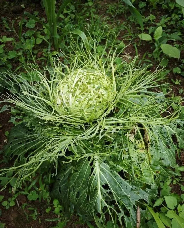 安徽有个小伙 , 种菜不打农药 , 结果种出了"蕾丝包菜" , 叶子全是洞 , 跟蕾丝花边似的~