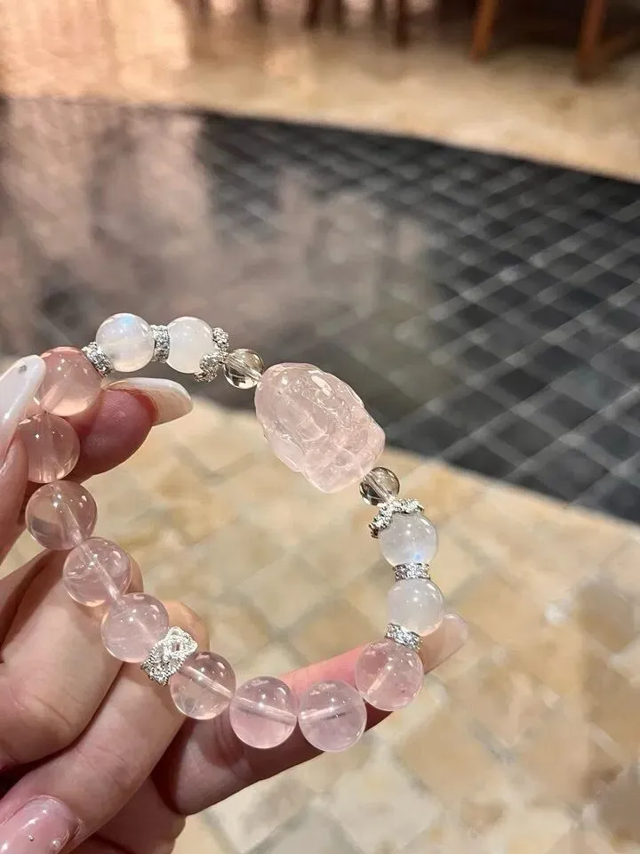 貔貅的造型更是点睛之笔,不是那种夸张俗气的设计,而是经过精细打磨的小巧款式,线条流畅圆润,既保留了貔貅招财避邪的传统寓意,又不会显得厚重累赘。珠体大小恰到好处,贴合手腕曲线,日常抬手、活动时完全不会硌手,不管是搭配通勤装的干练,还是约会裙的温柔,都能轻松驾驭,悄悄提升整体穿搭的精致度。