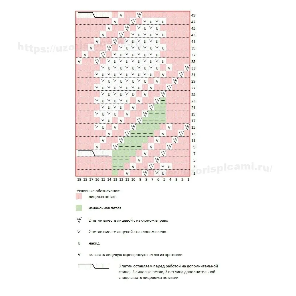 图解中仅给出了正面(奇数)行。在反面(偶数)行,所有针目按实际纹理编织。