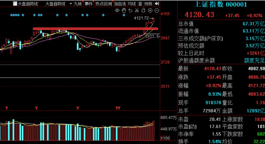 还是先说大盘,最近指数16连阳之后,已经放量站上了4100点,前些天咱们复盘里强调过成交量的重要性,现在从两万亿出头,放大了50%,日成交额已经超过了3万亿。