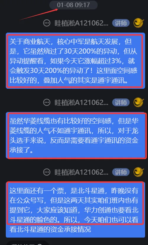 关于班内的教学含金量,还有咱们周四早上跟大家分析的票,班内开盘前的教学截图如下,当时讲了三个票:华菱线缆、通宇通讯、北斗星通而当天华菱线缆、通宇通讯收盘都涨停了,通宇通讯周五再次大涨6%
