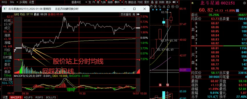 至于北斗星通,收盘上涨3.45%,但是,早上开盘后咱们班内讲解的内容,一方面是看它回踩五日线的支撑力度,另一方面则是它股价站上分时均线后的资金承接。(注意昨晚的干货教学)