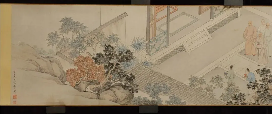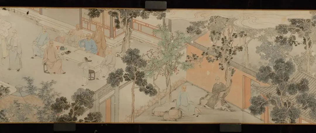 此为1847年绘制的文人雅集写真群像,近代书法家王运长(1874-1928)于1921年将其题名为《何蝯 [yuán] 叟顾祠春禊图》