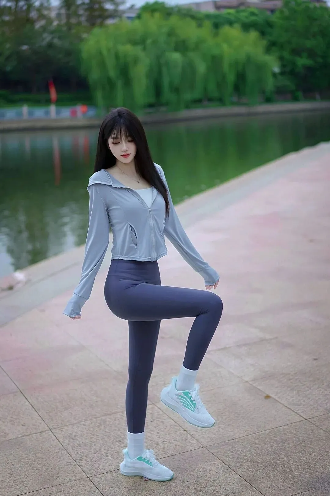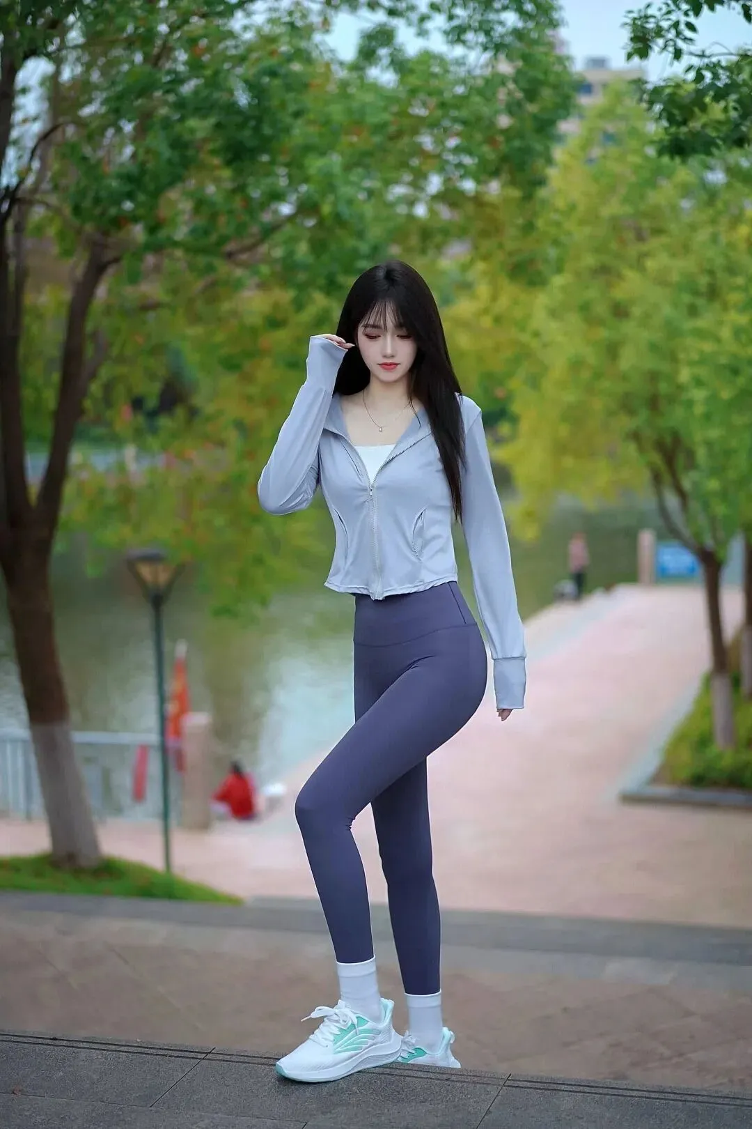 很多姐妹担心紧身裤会暴露身材缺点,但其实选对颜色和材质就完全不用怕。这种深色系的瑜伽裤自带修饰效果,加上面料有一定的压力感,能很好地收紧腿部线条。而且这个长度刚好到脚踝,露出一截白色运动袜,层次感立刻就出来了,整体look也更加清爽利落。
