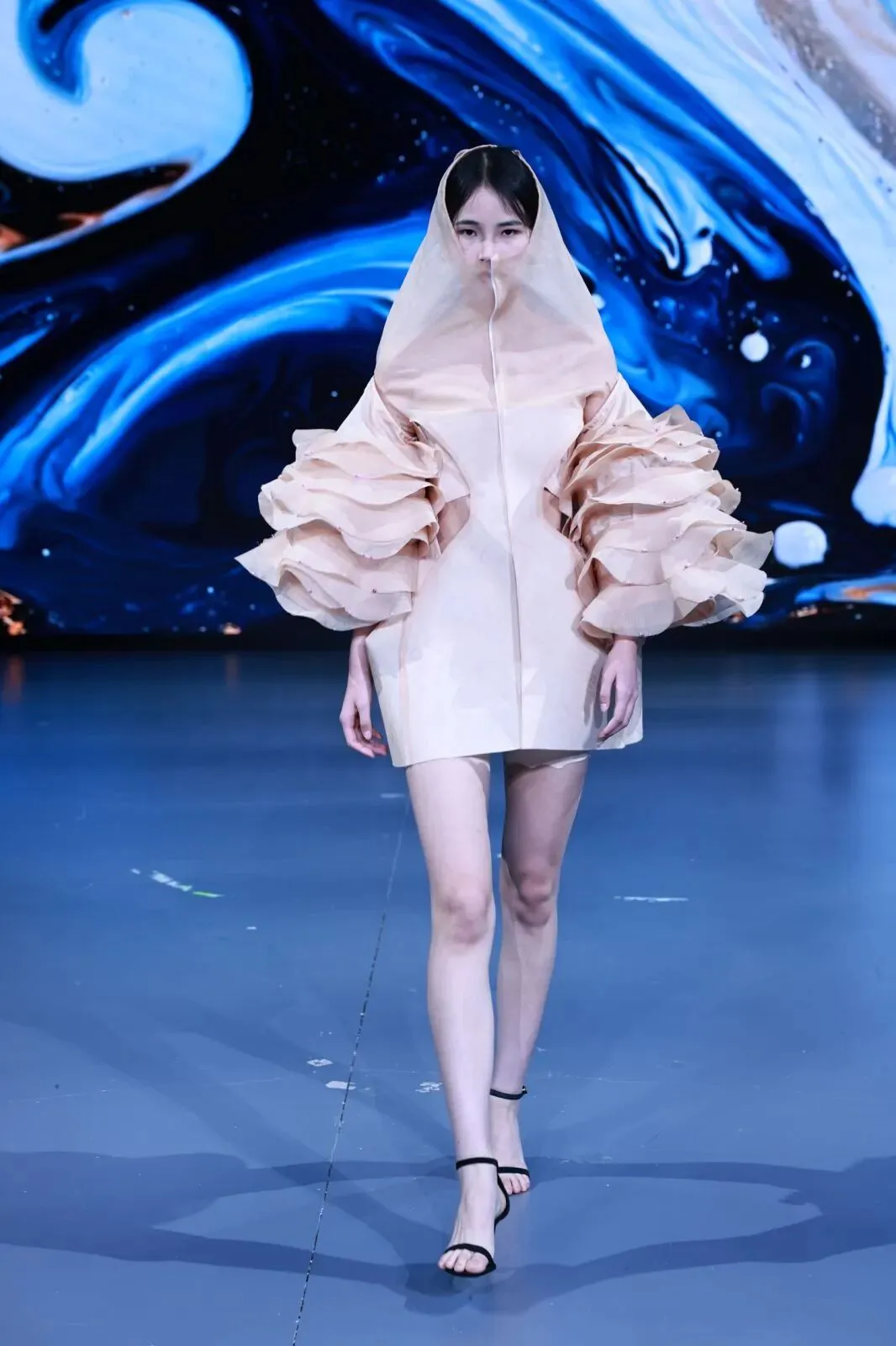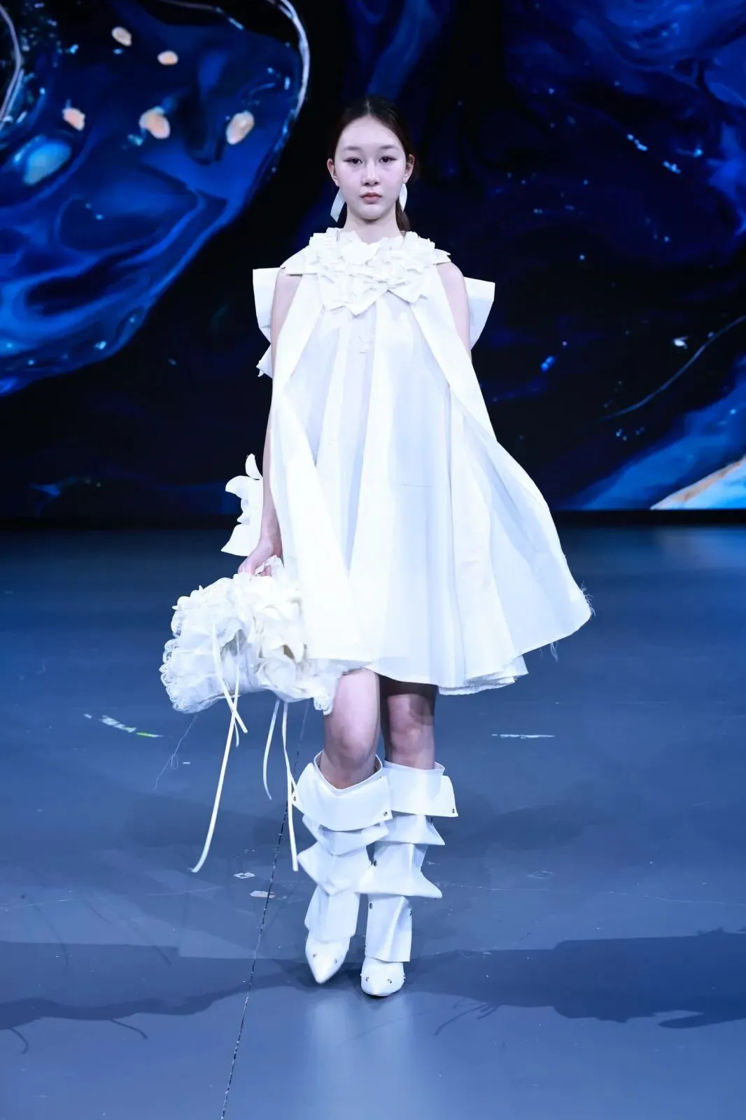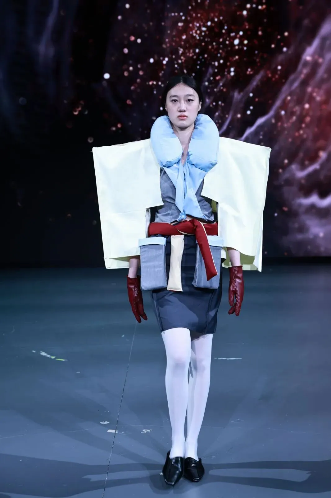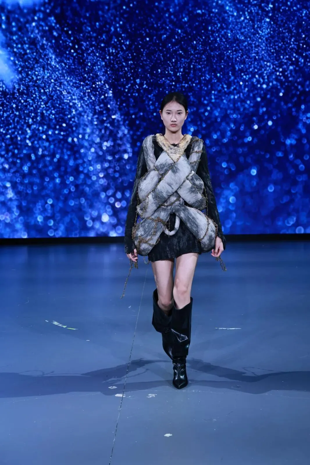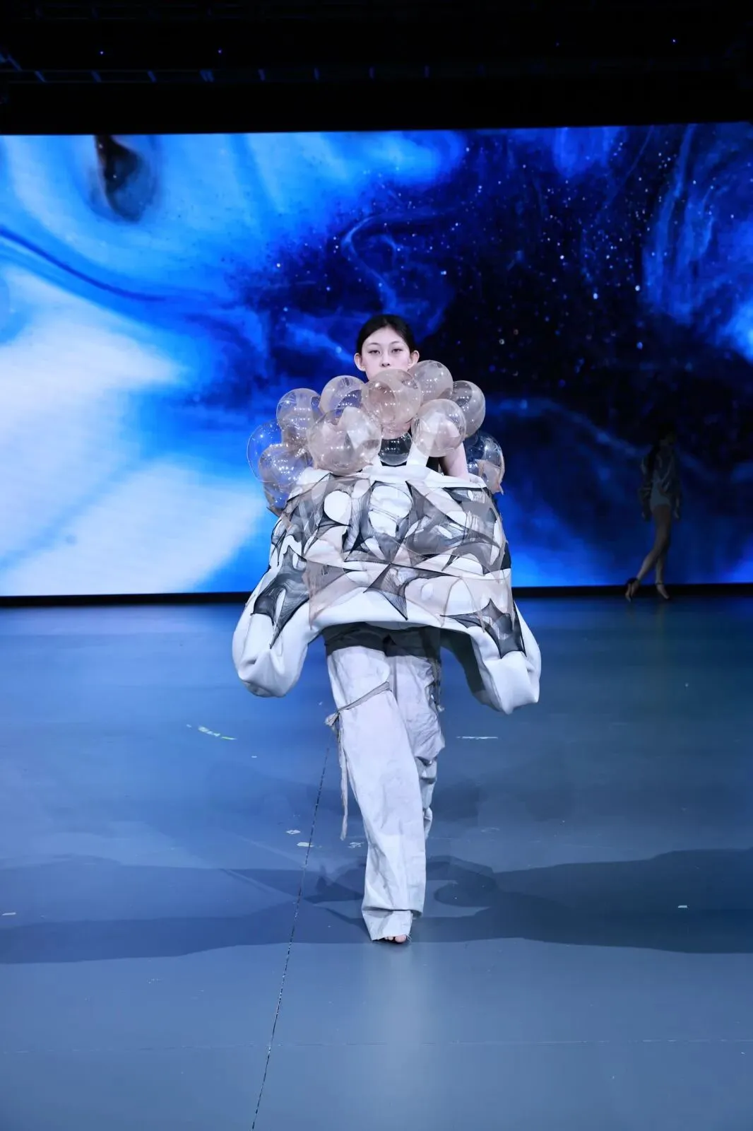 “经纬之外”,既蕴含对织物本源的突破,更承载对设计边界的深度思辨。本场秀以服装为核心载体,系统性探索服装本体、空间形态与身体感知的多元关联。同学们在经纬交织的传统织物结构之上,融入对形态美学、文化传承、科技赋能与自我表达的多维思考,让每一套亮相作品都成为承载独特叙事与设计灵魂的艺术载体。