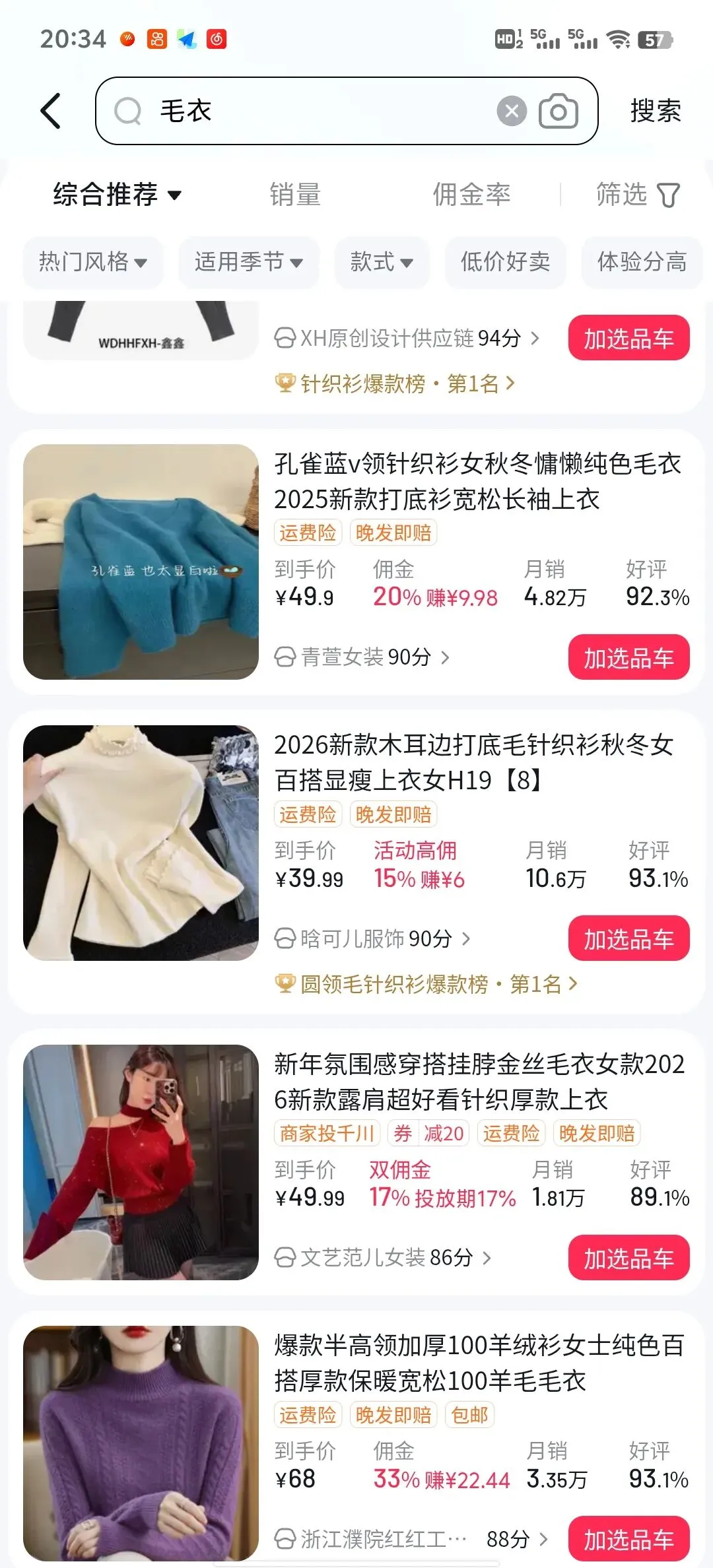 就拿女装来说,打开某音,找到创作者中心里的电商带货板块,搜“毛衣”,按佣金率排序,挑高佣的加进选品车,上架橱窗就行。