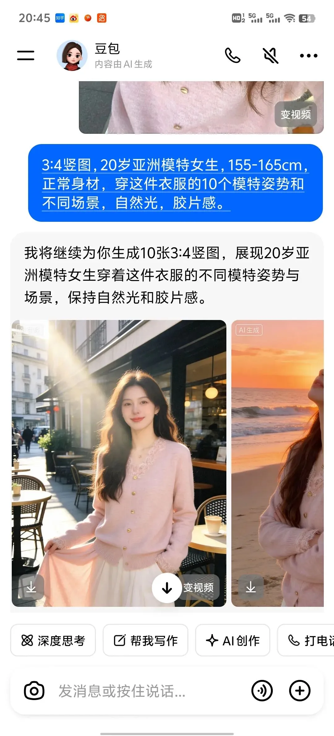 选好品,就轮到AI上场了。打开豆包AI,上传服装图片,输入提示词:“3:4竖图,20岁亚洲模特女生,155-165cm,正常身材,穿这件衣服的10个模特姿势和不同场景,自然光,胶片感。”一键生成穿搭图片